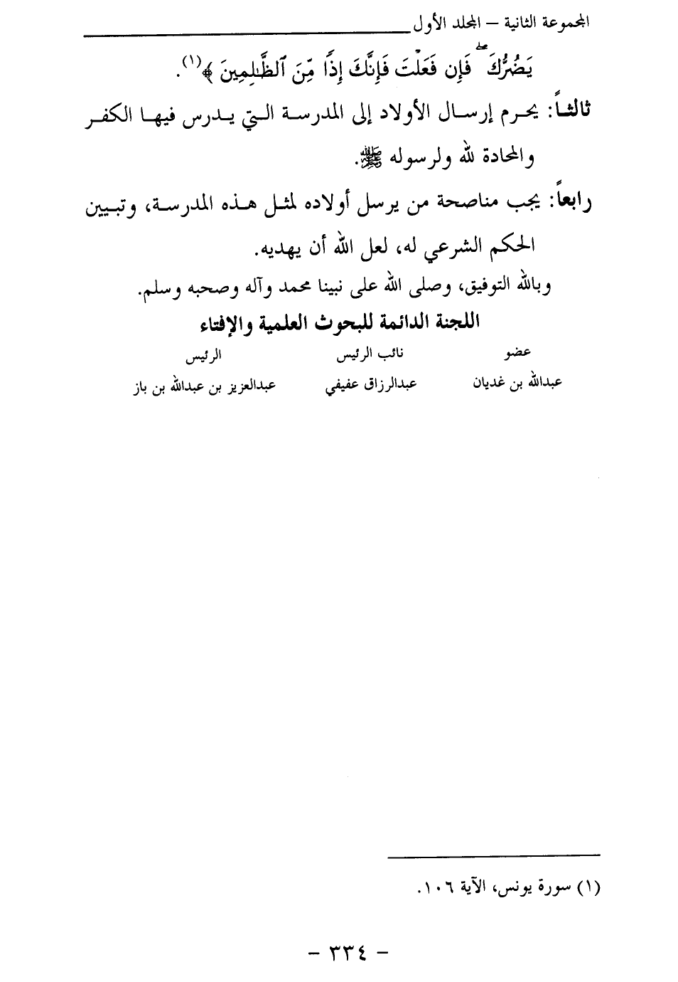 ثالثا: يحرم إرسال الأولاد إلى المدرسة التي يدرس فيها الكفر والمحادة لله ولرسوله - صلى الله عليه وسلم -.