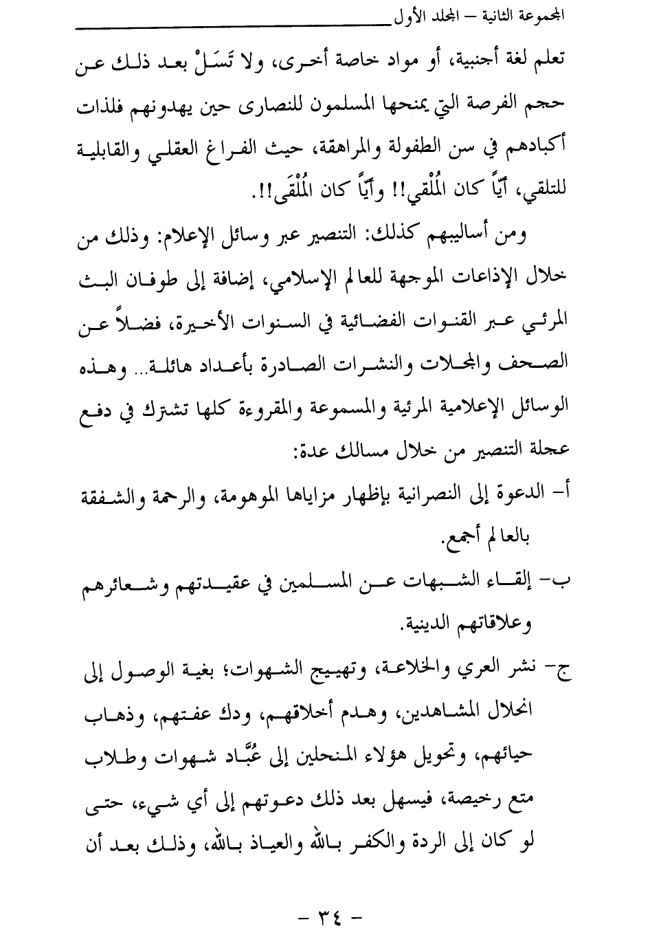 تعلم لغة أجنبية، أو مواد خاصة أخرى، ولا تسل بعد ذلك عن حجم الفرصة التي يمنحها المسلمون للنصارى حين يهدونهم فلذات أكبادهم في سن الطفولة والمراهقة، حيث الفراغ العقلي والقابلية للتلقي، أيا كان الملقي!! وأيا كان الملقى!! .