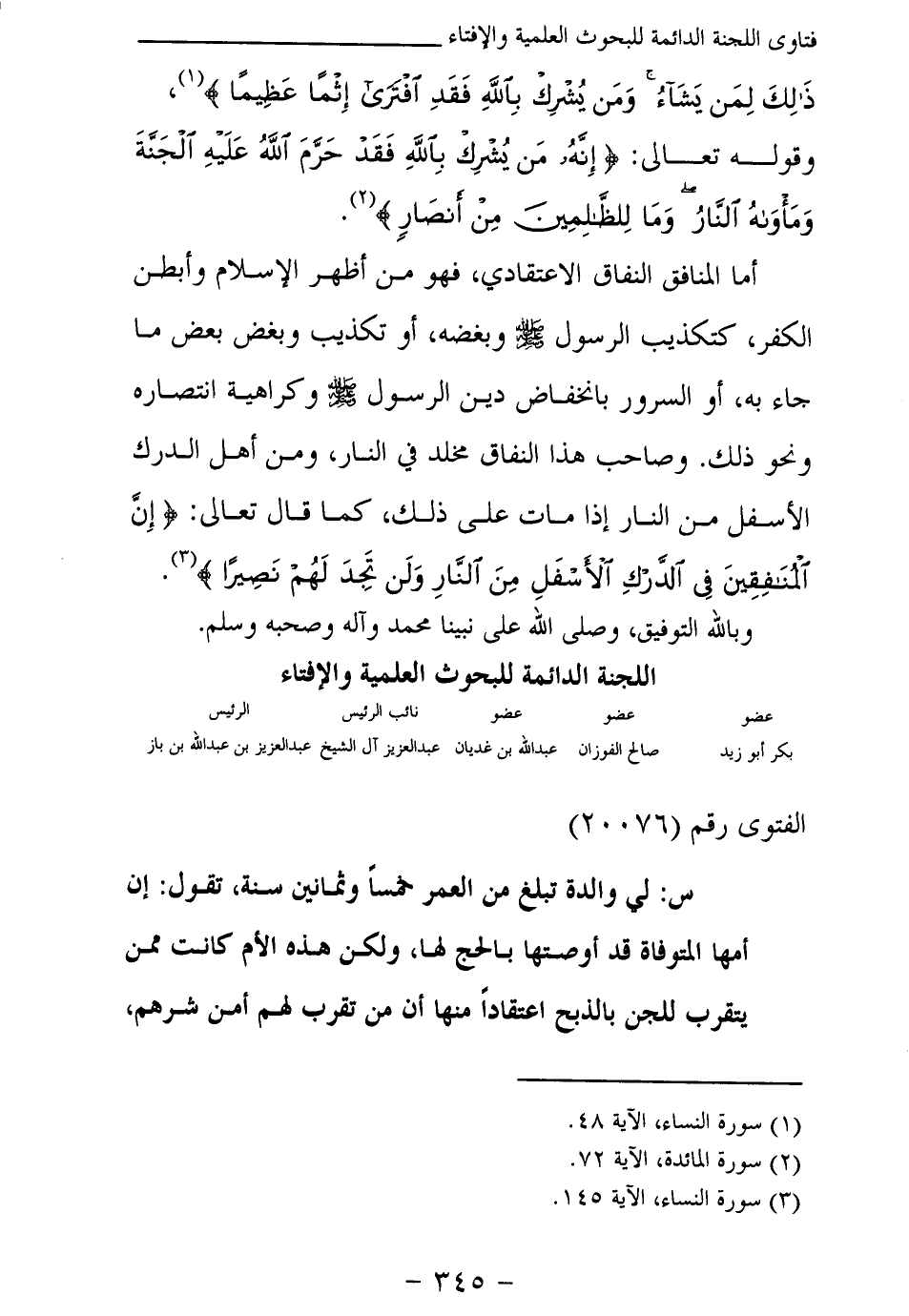 {إِنَّ اللَّهَ لَا يَغْفِرُ أَنْ يُشْرَكَ بِهِ وَيَغْفِرُ مَا دُونَ ذَلِكَ لِمَنْ يَشَاءُ وَمَنْ يُشْرِكْ بِاللَّهِ فَقَدِ افْتَرَى إِثْمًا عَظِيمًا} (¬1) وقوله تعالى: {إِنَّهُ مَنْ يُشْرِكْ بِاللَّهِ فَقَدْ حَرَّمَ اللَّهُ عَلَيْهِ الْجَنَّةَ وَمَأْوَاهُ النَّارُ وَمَا لِلظَّالِمِينَ مِنْ أَنْصَارٍ} (¬2) أما المنافق النفاق الاعتقادي، فهو من أظهر الإسلام وأبطن الكفر، كتكذيب الرسول - صلى الله عليه وسلم - وبغضه، أو تكذيب وبغض بعض ما جاء به، أو السرور بانخفاض دين الرسول - صلى الله عليه وسلم - وكراهية انتصاره ونحو ذلك. وصاحب هذا النفاق مخلد في النار، ومن أهل الدرك الأسفل من النار إذا مات على ذلك، كما قال تعالى: {إِنَّ الْمُنَافِقِينَ فِي الدَّرْكِ الْأَسْفَلِ مِنَ النَّارِ وَلَنْ تَجِدَ لَهُمْ نَصِيرًا} (¬3) وبالله التوفيق، وصلى الله على نبينا محمد وآله وصحبه وسلم.
