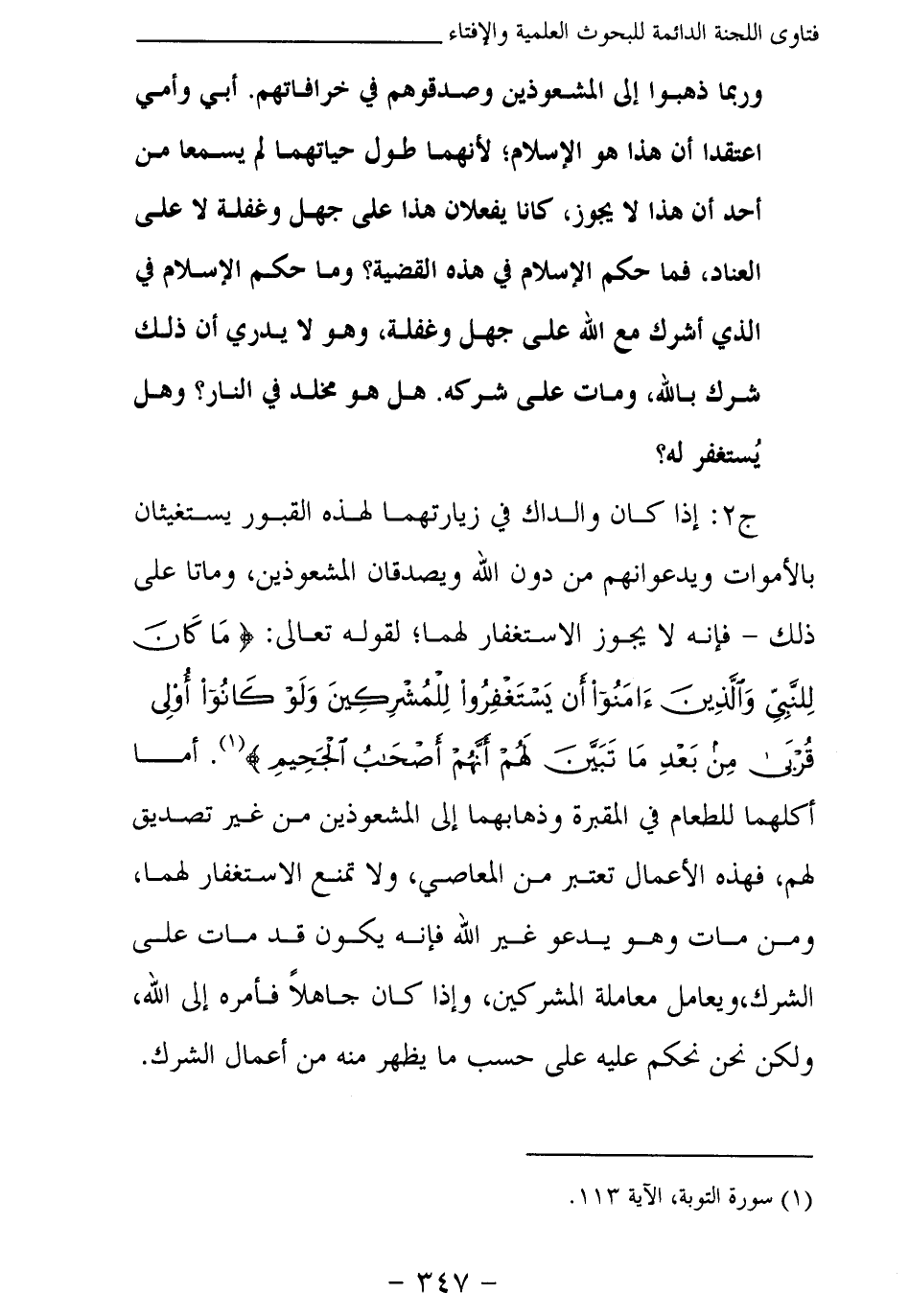 ج 2: إذا كان والداك في زيارتهما لهذه القبور يستغيثان بالأموات ويدعوانهم من دون الله ويصدقان المشعوذين، وماتا على ذلك - فإنه لا يجوز الاستغفار لهما؛ لقوله تعالى: {مَا كَانَ لِلنَّبِيِّ وَالَّذِينَ آمَنُوا أَنْ يَسْتَغْفِرُوا لِلْمُشْرِكِينَ وَلَوْ كَانُوا أُولِي قُرْبَى مِنْ بَعْدِ مَا تَبَيَّنَ لَهُمْ أَنَّهُمْ أَصْحَابُ الْجَحِيمِ} (¬1) أما أكلهما للطعام في المقبرة وذهابهما إلى المشعوذين من غير تصديق لهم، فهذه الأعمال تعتبر من المعاصي، ولا تمنع الاستغفار لهما، ومن مات وهو يدعو غير الله فإنه يكون قد مات على الشرك، ويعامل معاملة المشركين، وإذا كان جاهلا فأمره إلى الله، ولكن نحن نحكم عليه على حسب ما يظهر منه من أعمال الشرك.