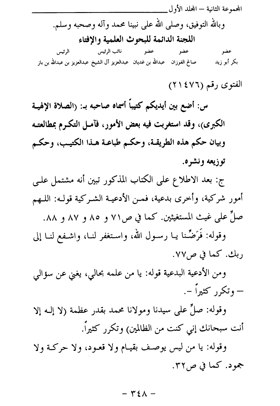 ج: بعد الاطلاع على الكتاب المذكور تبين أنه مشتمل على أمور شركية، وأخرى بدعية، فمن الأدعية الشركية قوله: اللهم صل على غيث المستغيثين. كما في ص 71 و 85 و 87 و 88. وقوله: فرضنا يا رسول الله، واستغفر لنا، واشفع لنا إلى ربك. كما في ص 77.