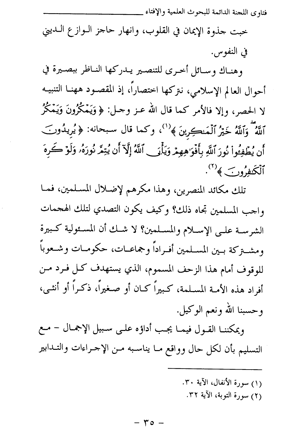 تلك مكائد المنصرين، وهذا مكرهم لإضلال المسلمين، فما واجب المسلمين تجاه ذلك؟ وكيف يكون التصدي لتلك الهجمات الشرسة على الإسلام والمسلمين؟ لا شك أن المسئولية كبيرة ومشتركة بين المسلمين أفرادا وجماعات، حكومات وشعوبا للوقوف أمام هذا الزحف المسموم، الذي يستهدف كل فرد من أفراد هذه الأمة المسلمة، كبيرا كان أو صغيرا، ذكرا أو أنثى، وحسبنا الله ونعم الوكيل.