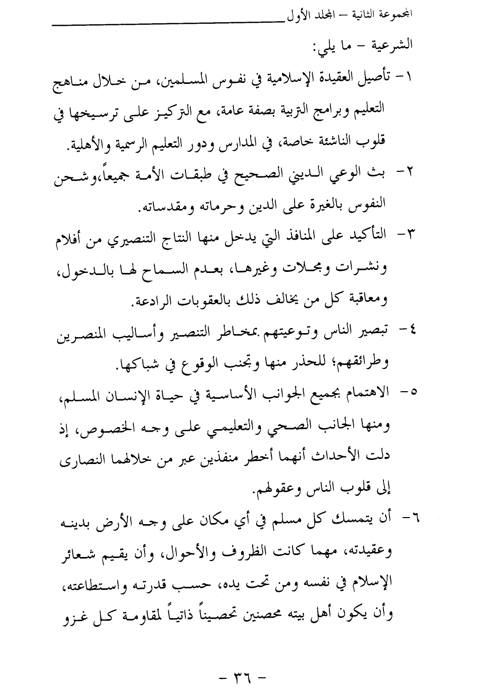 أ- تأصيل العقيدة الإسلامية في نفوس المسلمين، من خلال مناهج التعليم وبرامج التربية بصفة عامة، مع التركيز على ترسيخها في قلوب الناشئة خاصة، في المدارس ودور التعليم الرسمية والأهلية.