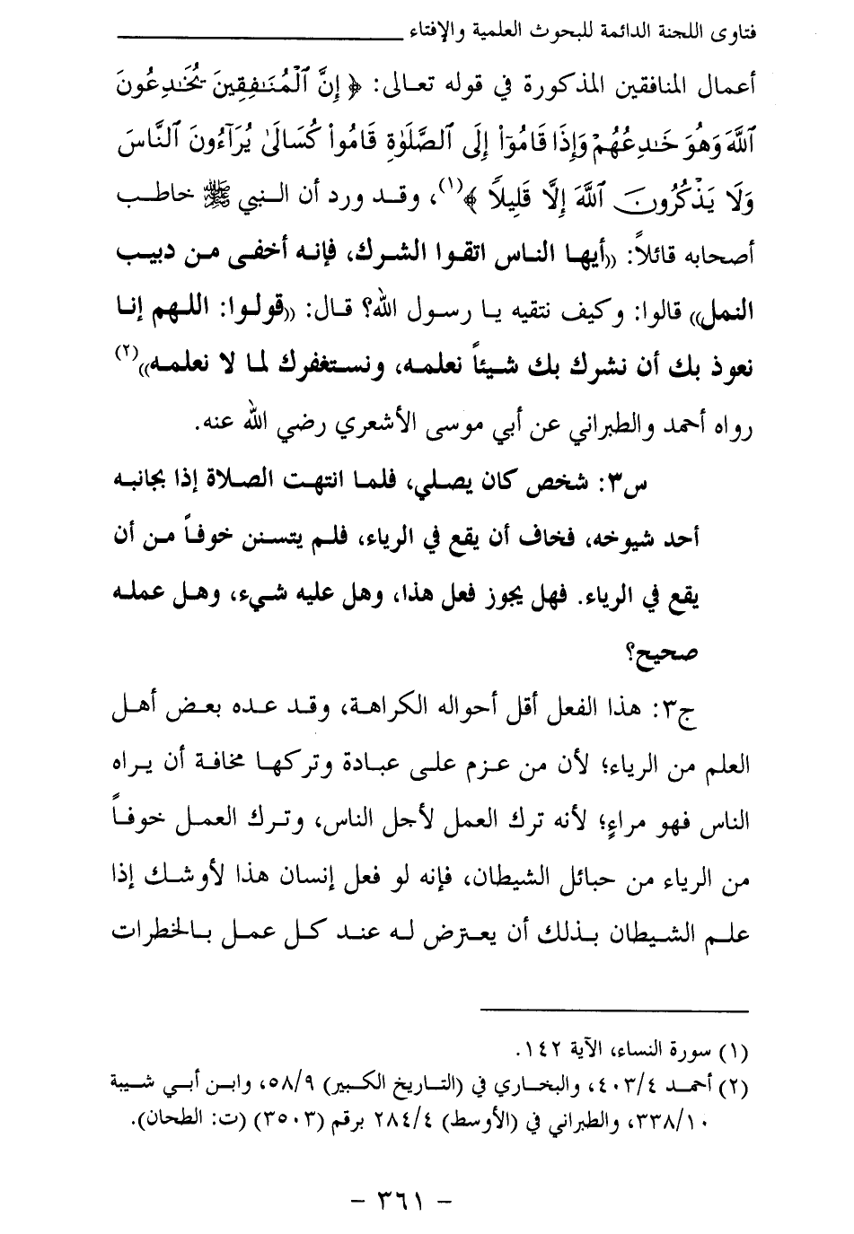 أعمال المنافقين المذكورة في قوله تعالى: {إِنَّ الْمُنَافِقِينَ يُخَادِعُونَ اللَّهَ وَهُوَ خَادِعُهُمْ وَإِذَا قَامُوا إِلَى الصَّلَاةِ قَامُوا كُسَالَى يُرَاءُونَ النَّاسَ وَلَا يَذْكُرُونَ اللَّهَ إِلَّا قَلِيلًا} (¬1) ، وقد ورد أن النبي - صلى الله عليه وسلم - خاطب أصحابه قائلا: «أيها الناس اتقوا الشرك، فإنه أخفى من دبيب النمل قالوا: وكيف نتقيه يا رسول الله؟ قال: قولوا: اللهم إنا نعوذ بك أن نشرك بك شيئا نعلمه، ونستغفرك لما لا نعلمه (¬2) » رواه أحمد والطبراني عن أبي موسى الأشعري - رضي الله عنه -.
