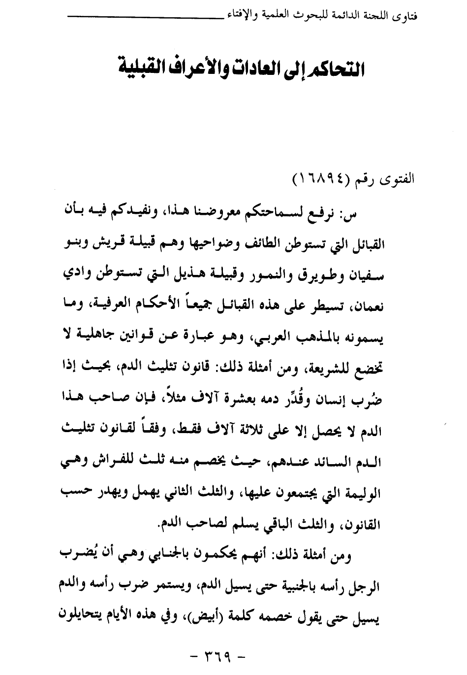 س: نرفع لسماحتكم معروضنا هذا، ونفيدكم فيه بأن القبائل التي تستوطن الطائف وضواحيها وهم قبيلة قريش وبنو سفيان وطويرق والنمور وقبيلة هذيل التي تستوطن وادي نعمان، تسيطر على هذه القبائل جميعا الأحكام العرفية، وما يسمونه بالمذهب العربي، وهو عبارة عن قوانين جاهلية لا تخضع للشريعة، ومن أمثلة ذلك: قانون تثليث الدم، بحيث إذا ضرب إنسان وقدر دمه بعشرة آلاف مثلا، فإن صاحب هذا الدم لا يحصل إلا على ثلاثة آلاف فقط، وفقا لقانون تثليث الدم السائد عندهم، حيث يخصم منه ثلث للفراش وهي الوليمة التي يجتمعون عليها، والثلث الثاني يهمل ويهدر حسب القانون، والثلث الباقي يسلم لصاحب الدم.
