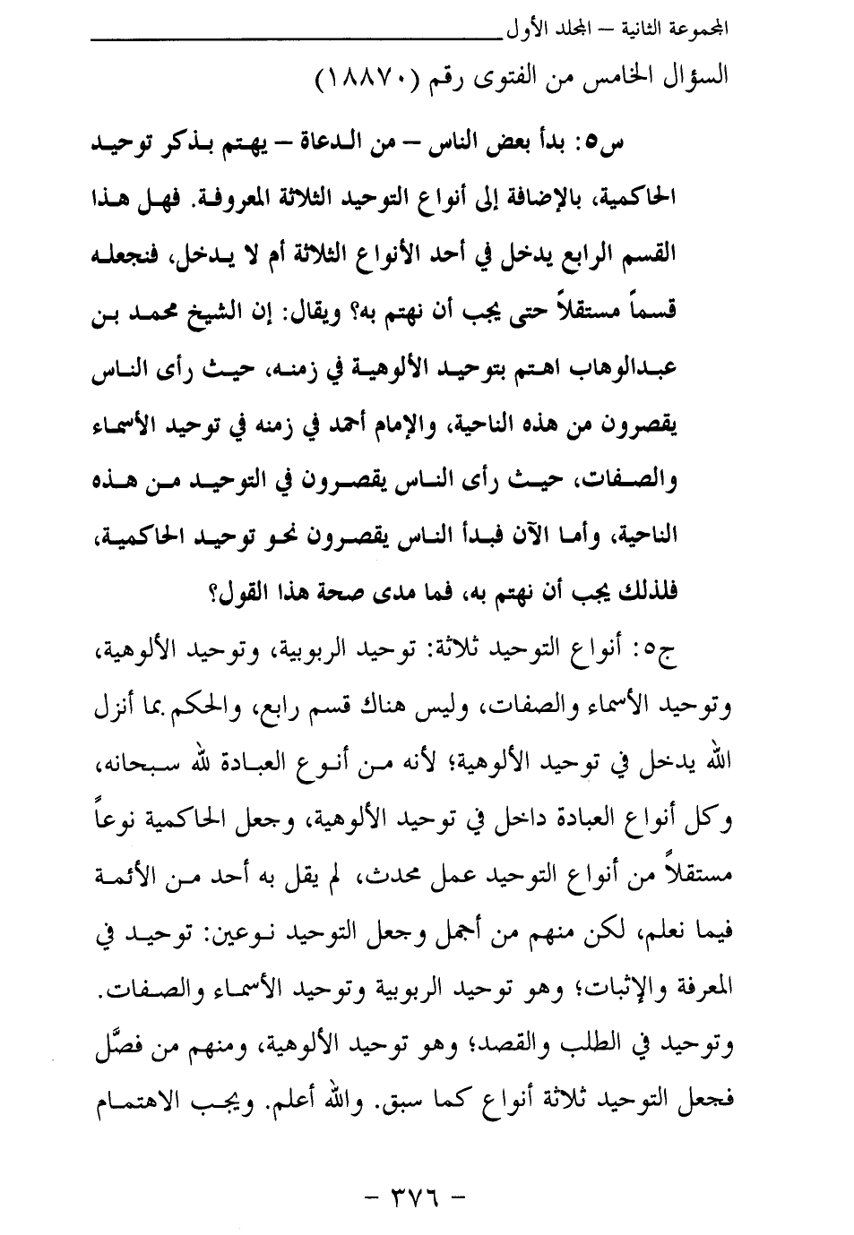 س 5: بدأ بعض الناس- من الدعاة- يهتم بذكر توحيد الحاكمية، بالإضافة إلى أنواع التوحيد الثلاثة المعروفة. فهل هذا القسم الرابع يدخل في أحد الأنواع الثلاثة أم لا يدخل، فنجعله قسما مستقلا حتى يجب أن نهتم به؟ ويقال: إن الشيخ محمد بن عبد الوهاب اهتم بتوحيد الألوهية في زمنه، حيث رأى الناس يقصرون من هذه الناحية، والإمام أحمد في زمنه في توحيد الأسماء والصفات، حيث رأى الناس يقصرون في التوحيد من هذه الناحية، وأما الآن فبدأ الناس يقصرون نحو توحيد الحاكمية، فلذلك يجب أن نهتم به، فما مدى صحة هذا القول؟
