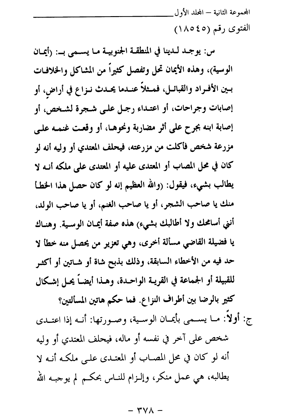 س: يوجد لدينا في المنطقة الجنوبية ما يسمى ب: (أيمان الوسية) ، وهذه الأيمان تحل وتفصل كثيرا من المشاكل والخلافات بين الأفراد والقبائل، فمثلا عندما يحدث نزاع في أراض، أو إصابات وجراحات، أو اعتداء رجل على شجرة لشخص، أو إصابة ابنه بجرح على أثر مضاربة ونحوها، أو وقعت غنمه على مزرعة شخص فأكلت من مزرعته، فيحلف المعتدي أو وليه أنه لو كان في محل المصاب أو المعتدى عليه أو المعتدى على ملكه أنه لا يطالب بشيء، فيقول: (والله العظيم إنه لو كان حصل هذا الخطأ منك يا صاحب الشجر، أو يا صاحب الغنم، أو يا صاحب الولد، أنني أسامحك ولا أطالبك بشيء) هذه صفة أيمان الوسية. وهناك يا فضيلة القاضي مسألة أخرى، وهي تعزير من يحصل منه خطأ لا حد فيه من الأخطاء السابقة، وذلك بذبح شاة أو شاتين أو أكثر للقبيلة أو الجماعة في القرية الواحدة، وهذا أيضا يحل إشكالا كثيرا بالرضا بين أطراف النزاع. فما حكم هاتين المسألتين؟