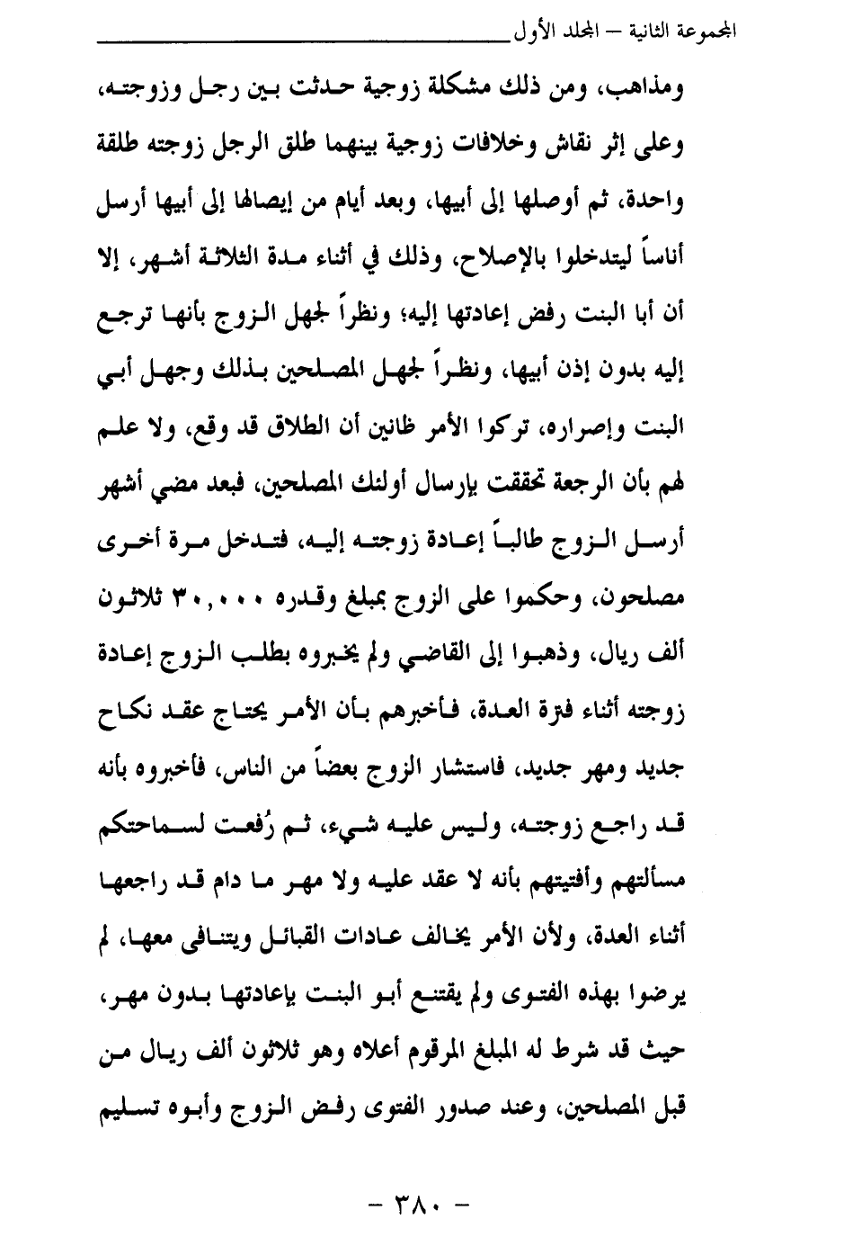 ومذاهب، ومن ذلك مشكلة زوجية حدثت بين رجل وزوجته، وعلى إثر نقاش وخلافات زوجية بينهما طلق الرجل زوجته طلقة واحدة، ثم أوصلها إلى أبيها، وبعد أيام من إيصالها إلى أبيها أرسل أناسا ليتدخلوا بالإصلاح، وذلك في أثناء مدة الثلاثة أشهر، إلا أن أبا البنت رفض إعادتها إليه؛ ونظرا لجهل الزوج بأنها ترجع إليه بدون إذن أبيها، ونظرا لجهل المصلحين بذلك وجهل أبي البنت وإصراره، تركوا الأمر ظانين أن الطلاق قد وقع، ولا علم لهم بأن الرجعة تحققت بإرسال أولئك المصلحين، فبعد مضي أشهر أرسل الزوج طالبا إعادة زوجته إليه، فتدخل مرة أخرى مصلحون، وحكموا على الزوج بمبلغ وقدره 30.000 ثلاثون ألف ريال، وذهبوا إلى القاضي ولم يخبروه بطلب الزوج إعادة زوجته أثناء فترة العدة، فأخبرهم بأن الأمر يحتاج عقد نكاح جديد ومهر جديد، فاستشار الزوج بعضا من الناس، فأخبروه بأنه قد راجع زوجته، وليس عليه شيء، ثم رفعت لسماحتكم مسألتهم وأفتيتهم بأنه لا عقد عليه ولا مهر ما دام قد راجعها أثناء العدة، ولأن الأمر يخالف عادات القبائل ويتنافى معها، لم يرضوا بهذه الفتوى ولم يقتنع أبو البنت بإعادتها بدون مهر، حيث قد شرط له المبلغ المدفوع أعلاه وهو ثلاثون ألف ريال من قبل المصلحين، وعند صدور الفتوى رفض الزوج وأبوه تسليم