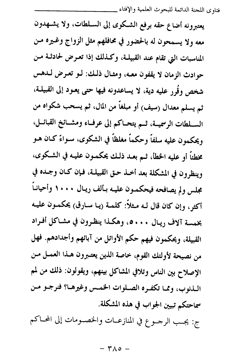 يعتبرونه أضاع حقه برفع الشكوى إلى السلطات، ولا يشهدون معه ولا يسمحون له بالحضور في محافلهم مثل الزواج وغيره من المناسبات التي تقام عند القبيلة، وكذلك إذا تعرض لحادثة من حوادث الزمان لا يقفون معه، ومثال ذلك: لو تعرض لدهس شخص وقرر عليه دية، لا يساعدونه فيها حتى يعود إلى القبيلة، ثم يسلم معدال (سيف) أو مبلغا من المال، ثم يسحب شكواه من السلطات الرسمية، ثم يتحاكم إلى عرفاء ومشائخ القبائل، ويحكمون عليه سلفا وحكما مغلظا في الشكوى، سواء كان هو مخطئا أو عليه الخطأ، ثم بعد ذلك يحكمون عليه في الشكوى، وينظرون في المشكلة بعد أخذ حق القبيلة، فإن كان وجده في مجلس ولم يصافحه فيحكمون عليه بألف ريال 1000 وأحيانا أكثر، وإن كان قال له مثلا: كلمة (يا سارق) يحكمون عليه بخمسة آلاف ريال 5000، وهكذا ينظرون في مشاكل أفراد القبيلة، ويحكمون فيهم حكم الأوائل من آبائهم. وأجدادهم. فهل من نصيحة لأولئك القوم، خاصة الذين يعتبرون هذا العمل من الإصلاح بين الناس وتلافي المشاكل بينهم، ويقولون: ذلك من لمم الذنوب، ومما تكفره الصلوات الخمس وغيرها؟ فنرجو من سماحتكم تبيين الجواب في هذه المشكلة.