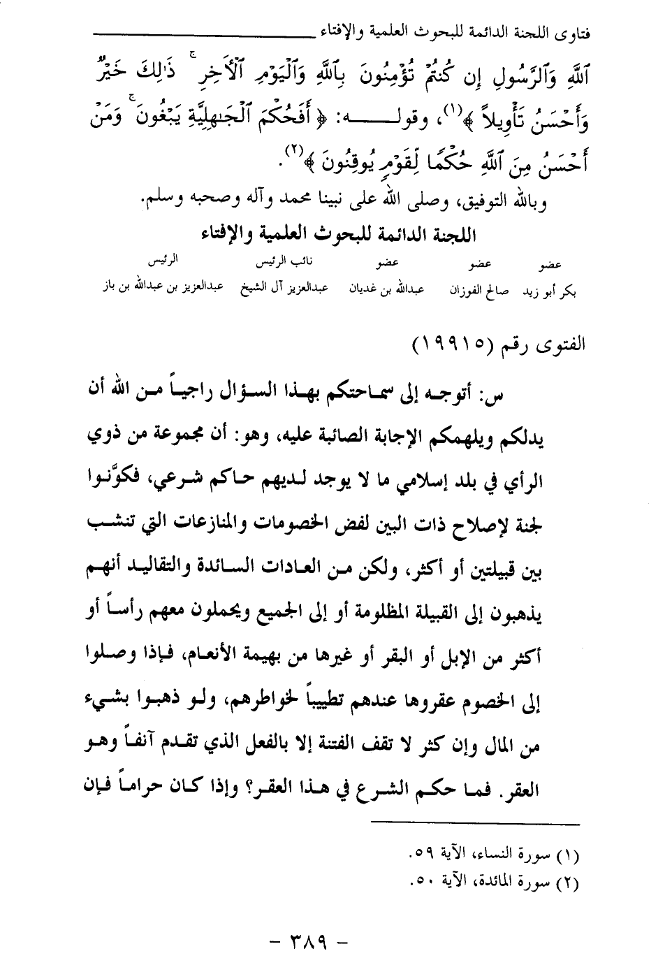 س: أتوجه إلى سماحتكم بهذا السؤال راجيا من الله أن يدلكم ويلهمكم الإجابة الصائبة عليه، وهو: أن مجموعة من ذوي الرأي في بلد إسلامي ما لا يوجد لديهم حاكم شرعي، فكونوا لجنة لإصلاح ذات البين لفض الخصومات والمنازعات التي تنشب بين قبيلتين أو أكثر، ولكن من العادات السائدة والتقاليد أنهم يذهبون إلى القبيلة المظلومة أو إلى الجميع ويحملون معهم رأسا أو أكثر من الإبل أو البقر أو غيرها من بهيمة الأنعام، فإذا وصلوا إلى الخصوم عقروها عندهم تطييبا لخواطرهم، ولو ذهبوا بشيء من المال وإن كثر لا تقف الفتنة إلا بالفعل الذي تقدم آنفا وهو العقر. فما حكم الشرع في هذا العقر؟ وإذا كان حراما فإن