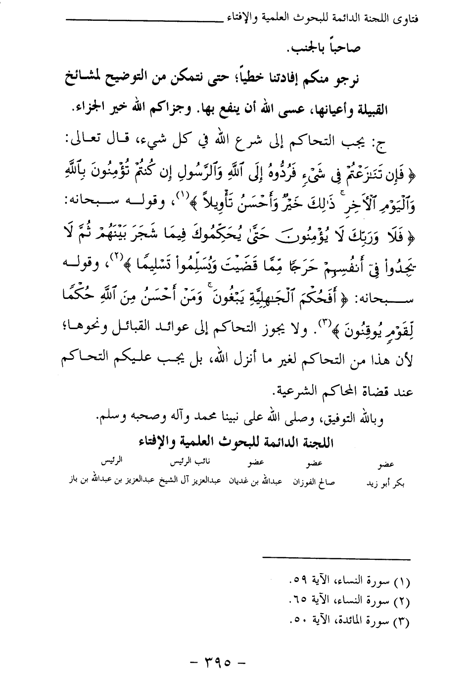 ج: يجب التحاكم إلى شرع الله في كل شيء، قال تعالى: {فَإِنْ تَنَازَعْتُمْ فِي شَيْءٍ فَرُدُّوهُ إِلَى اللَّهِ وَالرَّسُولِ إِنْ كُنْتُمْ تُؤْمِنُونَ بِاللَّهِ وَالْيَوْمِ الْآخِرِ ذَلِكَ خَيْرٌ وَأَحْسَنُ تَأْوِيلًا} (¬1) ، وقوله سبحانه: {فَلَا وَرَبِّكَ لَا يُؤْمِنُونَ حَتَّى يُحَكِّمُوكَ فِيمَا شَجَرَ بَيْنَهُمْ ثُمَّ لَا يَجِدُوا فِي أَنْفُسِهِمْ حَرَجًا مِمَّا قَضَيْتَ وَيُسَلِّمُوا تَسْلِيمًا} (¬2) ، وقوله سبحانه: {أَفَحُكْمَ الْجَاهِلِيَّةِ يَبْغُونَ وَمَنْ أَحْسَنُ مِنَ اللَّهِ حُكْمًا لِقَوْمٍ يُوقِنُونَ} (¬3) ولا يجوز التحاكم إلى عوائد القبائل ونحوها؛ لأن هذا من التحاكم لغير ما أنزل الله، بل يجب عليكم التحاكم عند قضاة المحاكم الشرعية.