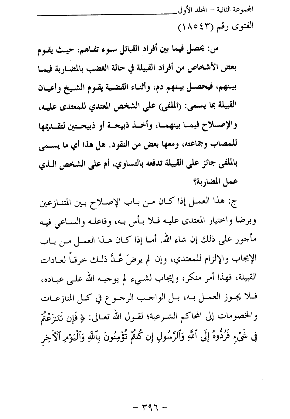 ج: هذا العمل إذا كان من باب الإصلاح بين المتنازعين وبرضا واختيار المعتدى عليه فلا بأس به، وفاعله والساعي فيه مأجور على ذلك إن شاء الله. أما إذا كان هذا العمل من باب الإيجاب والإلزام للمعتدي، وإن لم يرض عد ذلك خرقا لعادات القبيلة، فهذا أمر منكر، وإيجاب لشيء لم يوجبه الله على عباده، فلا يجوز العمل به، بل الواجب الرجوع في كل المنازعات والخصومات إلى المحاكم الشرعية؛ لقول الله تعالى: {فَإِنْ تَنَازَعْتُمْ فِي شَيْءٍ فَرُدُّوهُ إِلَى اللَّهِ وَالرَّسُولِ إِنْ كُنْتُمْ تُؤْمِنُونَ بِاللَّهِ وَالْيَوْمِ الْآخِرِ ذَلِكَ خَيْرٌ وَأَحْسَنُ تَأْوِيلًا} (¬1) ،