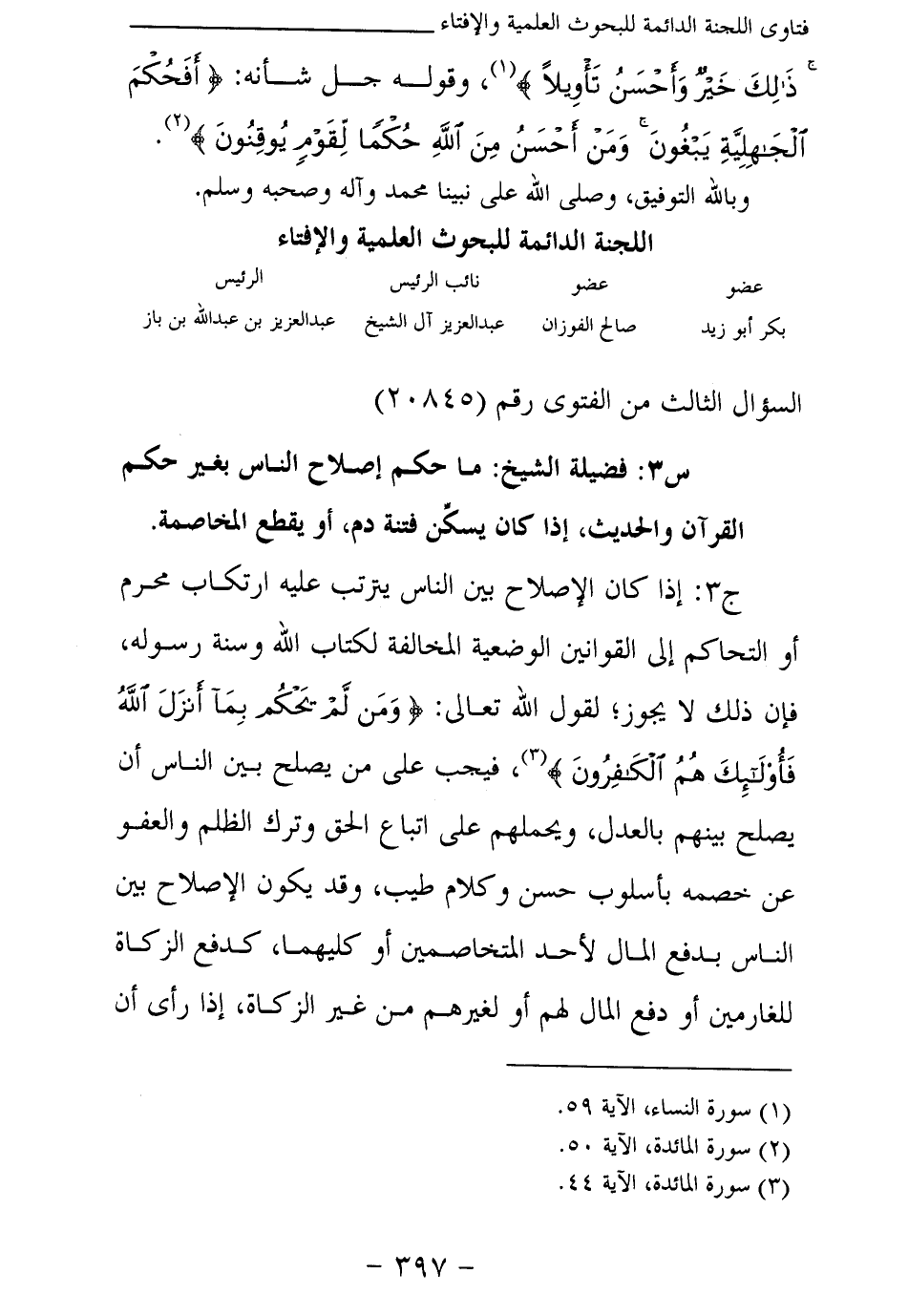 ج 3: إذا كان الإصلاح بين الناس يترتب عليه ارتكاب محرم أو التحاكم إلى القوانين الوضعية المخالفة لكتاب الله وسنة رسوله، فإن ذلك لا يجوز؛ لقول الله تعالى: {وَمَنْ لَمْ يَحْكُمْ بِمَا أَنْزَلَ اللَّهُ فَأُولَئِكَ هُمُ الْكَافِرُونَ} (¬1) ، فيجب على من يصلح بين الناس أن يصلح بينهم بالعدل، ويحملهم على اتباع الحق وترك الظلم والعفو عن خصمه بأسلوب حسن وكلام طيب، وقد يكون الإصلاح بين الناس بدفع المال لأحد المتخاصمين أو كليهما، كدفع الزكاة للغارمين أو دفع المال لهم أو لغيرهم من غير الزكاة، إذا رأى أن