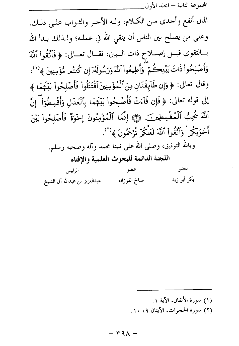 المال أنفع وأجدى من الكلام، وله الأجر والثواب على ذلك. وعلى من يصلح بين الناس أن يتقي الله في عمله، ولذلك بدأ الله بالتقوى قبل إصلاح ذات البين، فقال تعالى: {فَاتَّقُوا اللَّهَ وَأَصْلِحُوا ذَاتَ بَيْنِكُمْ وَأَطِيعُوا اللَّهَ وَرَسُولَهُ إِنْ كُنْتُمْ مُؤْمِنِينَ} (¬1) ، وقال تعالى: {وَإِنْ طَائِفَتَانِ مِنَ الْمُؤْمِنِينَ اقْتَتَلُوا فَأَصْلِحُوا بَيْنَهُمَا} (¬2) إلى قوله تعالى: {فَإِنْ فَاءَتْ فَأَصْلِحُوا بَيْنَهُمَا بِالْعَدْلِ وَأَقْسِطُوا إِنَّ اللَّهَ يُحِبُّ الْمُقْسِطِينَ} (¬3) {إِنَّمَا الْمُؤْمِنُونَ إِخْوَةٌ فَأَصْلِحُوا بَيْنَ أَخَوَيْكُمْ وَاتَّقُوا اللَّهَ لَعَلَّكُمْ تُرْحَمُونَ} (¬4)