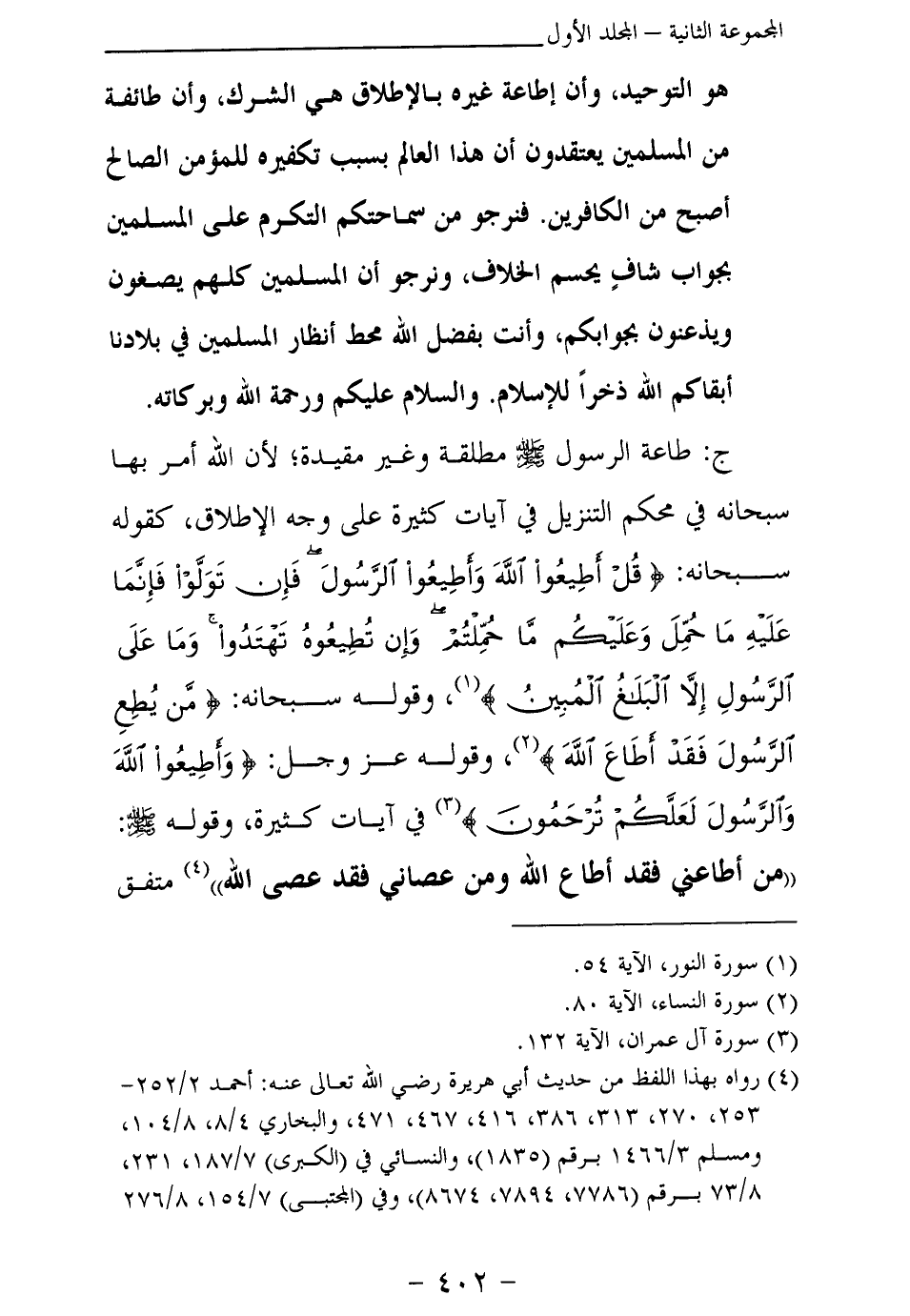 ج: طاعة الرسول صلى الله عليه وسلم مطلقة وغير مقيدة، لأن الله أمر بها سبحانه في محكم التنزيل في آيات كثيرة على وجه الإطلاق، كقوله سبحانه: {قُلْ أَطِيعُوا اللَّهَ وَأَطِيعُوا الرَّسُولَ فَإِنْ تَوَلَّوْا فَإِنَّمَا عَلَيْهِ مَا حُمِّلَ وَعَلَيْكُمْ مَا حُمِّلْتُمْ وَإِنْ تُطِيعُوهُ تَهْتَدُوا وَمَا عَلَى الرَّسُولِ إِلَّا الْبَلَاغُ الْمُبِينُ} (¬1) ، وقوله سبحانه: {مَنْ يُطِعِ الرَّسُولَ فَقَدْ أَطَاعَ اللَّهَ} (¬2) وقوله عز وجل: {وَأَطِيعُوا اللَّهَ وَالرَّسُولَ لَعَلَّكُمْ تُرْحَمُونَ} (¬3) في آيات كثيرة، وقوله صلى الله عليه وسلم: «من أطاعني فقد أطاع الله ومن عصاني فقد عصى الله (¬4) » متفق