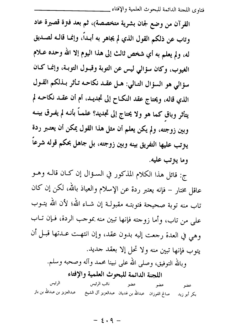 القرآن من وضع لجان بشرية متخصصة) ، ثم بعد فترة قصيرة عاد وتاب عن ذلكم القول الذي لم يجاهر به أبدا، وإنما قاله لصديق له، ولم يعلم به أي شخص ثالث إلى هذا اليوم، إلا الله وحده علام الغيوب، وكان سؤالي ليس عن التوبة وقبول التوبة، وإنما كان سؤالي هو السؤال التالي: هل عقد نكاحه تأثر بذلكم القول الذي قاله، ويحتاج عقد النكاح إلى تجديد، أم أن عقد نكاحه لم يتأثر وباق كما هو ولا يحتاج إلى تجديد؟ علما بأنه لم يفرق بينه وبين زوجته، ولم يكن يعلم أن مثل هذا القول يمكن أن يعتبر ردة يترتب عليها التفريق بينه وبين زوجته، بل جاهل بحكم قوله شرعا وما يترتب عليه.