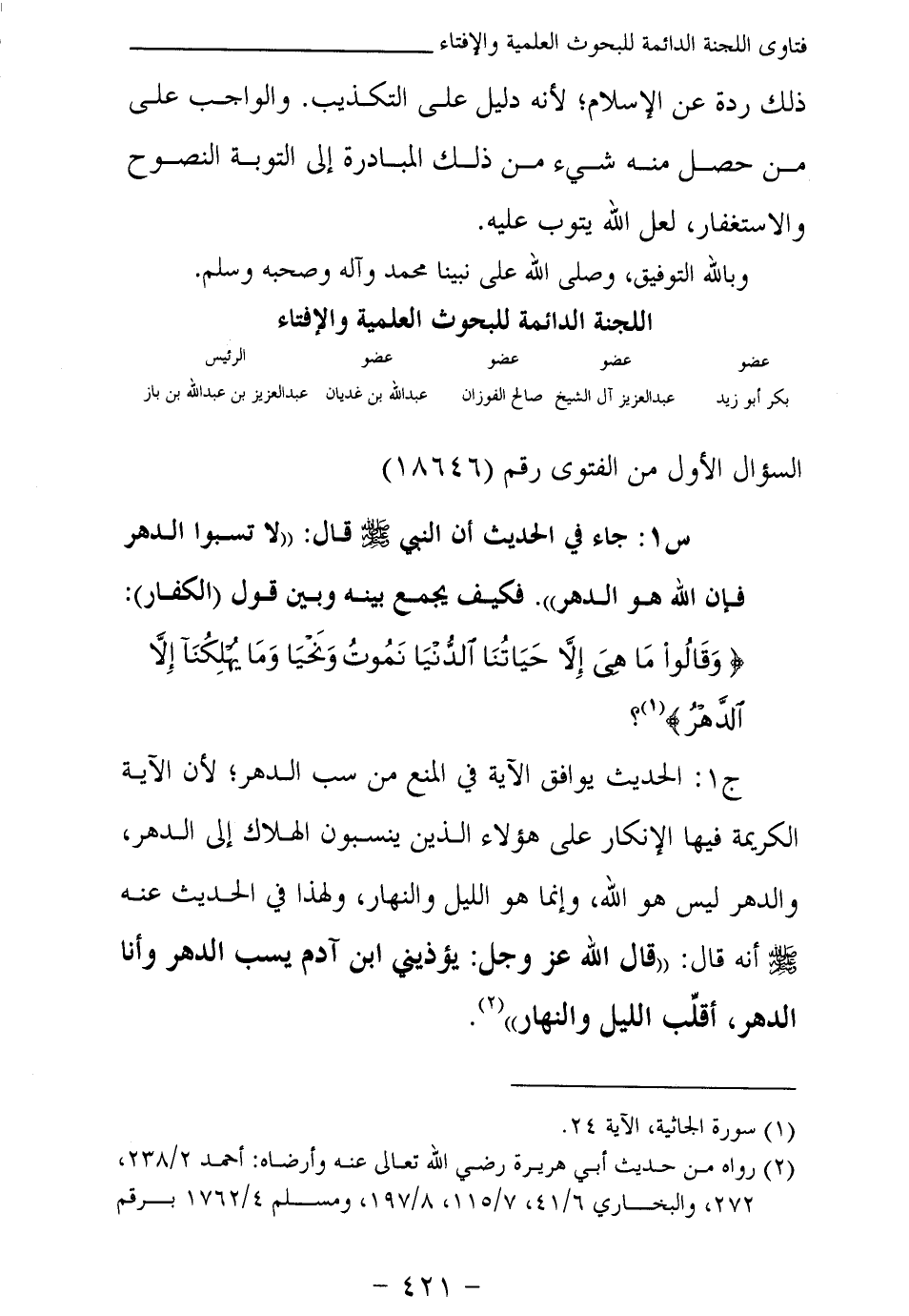 ج1: الحديث يوافق الآية في المنع من سب الدهر؛ لأن الآية الكريمة فيها الإنكار على هؤلاء الذين ينسبون الهلاك إلى الدهر، والدهر ليس هو الله، وإنما هو الليل والنهار، ولهذا في الحديث عنه صلى الله عليه وسلم أنه قال: «قال الله عز وجل: يؤذيني ابن آدم يسب الدهر وأنا الدهر، أقلب الليل والنهار (¬2) »