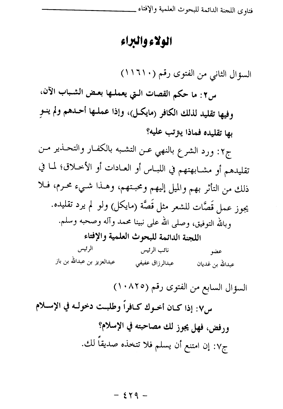 س 2: ما حكم القصات التي يعملها بعض الشباب الآن، وفيها تقليد لذلك الكافر (مايكل) ، وإذا عملها أحدهم ولم ينو بها تقليده فماذا يترتب عليه؟