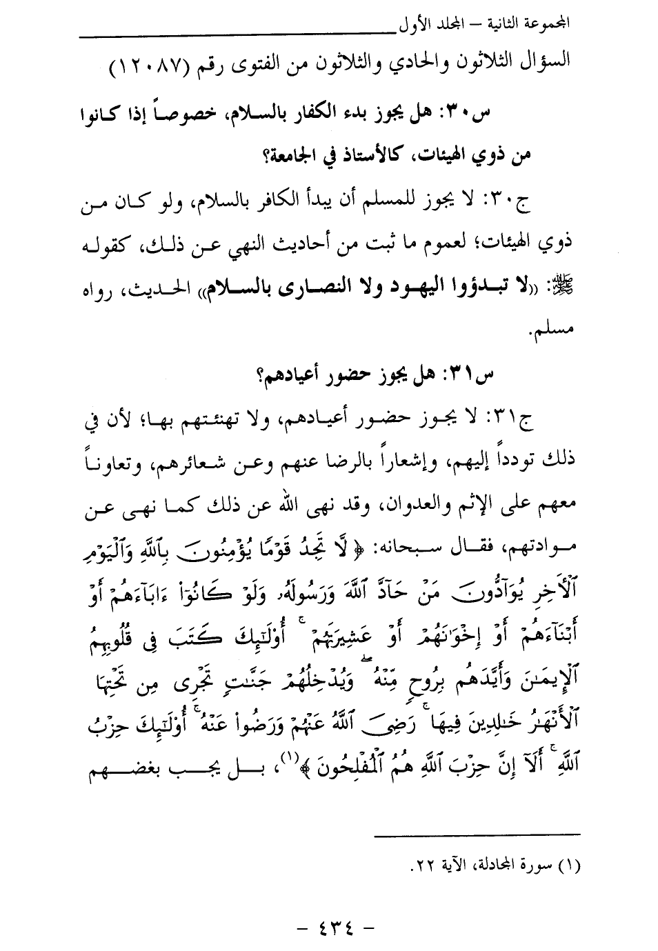 ج 31: لا يجوز حضور أعيادهم، ولا تهنئتهم بها؛ لأن في ذلك توددا إليهم، وإشعارا بالرضا عنهم وعن شعائرهم، وتعاونا معهم على الإثم والعدوان، وقد نهى الله عن ذلك كما نهى عن موادتهم، فقال سبحانه: {لَا تَجِدُ قَوْمًا يُؤْمِنُونَ بِاللَّهِ وَالْيَوْمِ الْآخِرِ يُوَادُّونَ مَنْ حَادَّ اللَّهَ وَرَسُولَهُ وَلَوْ كَانُوا آبَاءَهُمْ أَوْ أَبْنَاءَهُمْ أَوْ إِخْوَانَهُمْ أَوْ عَشِيرَتَهُمْ أُولَئِكَ كَتَبَ فِي قُلُوبِهِمُ الْإِيمَانَ وَأَيَّدَهُمْ بِرُوحٍ مِنْهُ وَيُدْخِلُهُمْ جَنَّاتٍ تَجْرِي مِنْ تَحْتِهَا الْأَنْهَارُ خَالِدِينَ فِيهَا رَضِيَ اللَّهُ عَنْهُمْ وَرَضُوا عَنْهُ أُولَئِكَ حِزْبُ اللَّهِ أَلَا إِنَّ حِزْبَ اللَّهِ هُمُ الْمُفْلِحُونَ} (¬1) ، بل يجب بغضهم