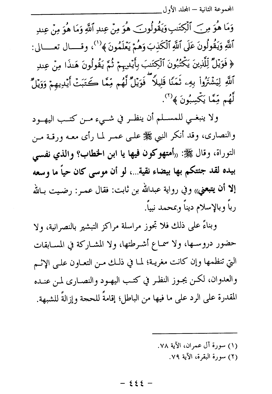 ولا ينبغي للمسلم أن ينظر في شيء من كتب اليهود والنصارى، وقد أنكر النبي صلى الله عليه وسلم على عمر لما رأى معه ورقة من التوراة، وقال صلى الله عليه وسلم «أمتهوكون فيها يا ابن الخطاب؟! والذي نفسي بيده لقد جئتكم بها بيضاء نقية. . .، لو أن موسى كان حيا ما وسعه إلا أن يتبعني) وفي رواية عبد الله بن ثابت: فقال عمر: رضيت بالله ربا وبالإسلام دينا وبمحمد نبيا (¬3) » .
