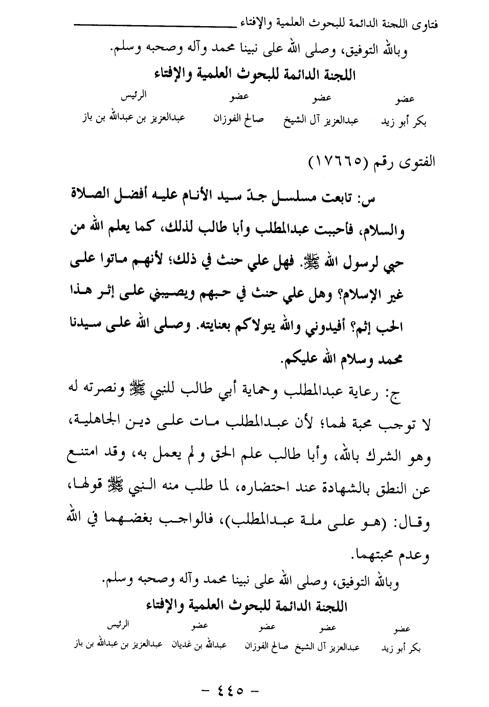 ج: رعاية عبد المطلب وحماية أبي طالب للنبي صلى الله عليه وسلم ونصرته له لا توجب محبة لهما، لأن عبد المطلب مات على دين الجاهلية، وهو الشرك بالله، وأبا طالب علم الحق ولم يعمل به، وقد امتنع عن النطق بالشهادة عند احتضاره، لما طلب منه النبي صلى الله عليه وسلم قولها، وقال: (هو على ملة عبد المطلب) ، فالواجب بغضهما في الله وعدم محبتهما.