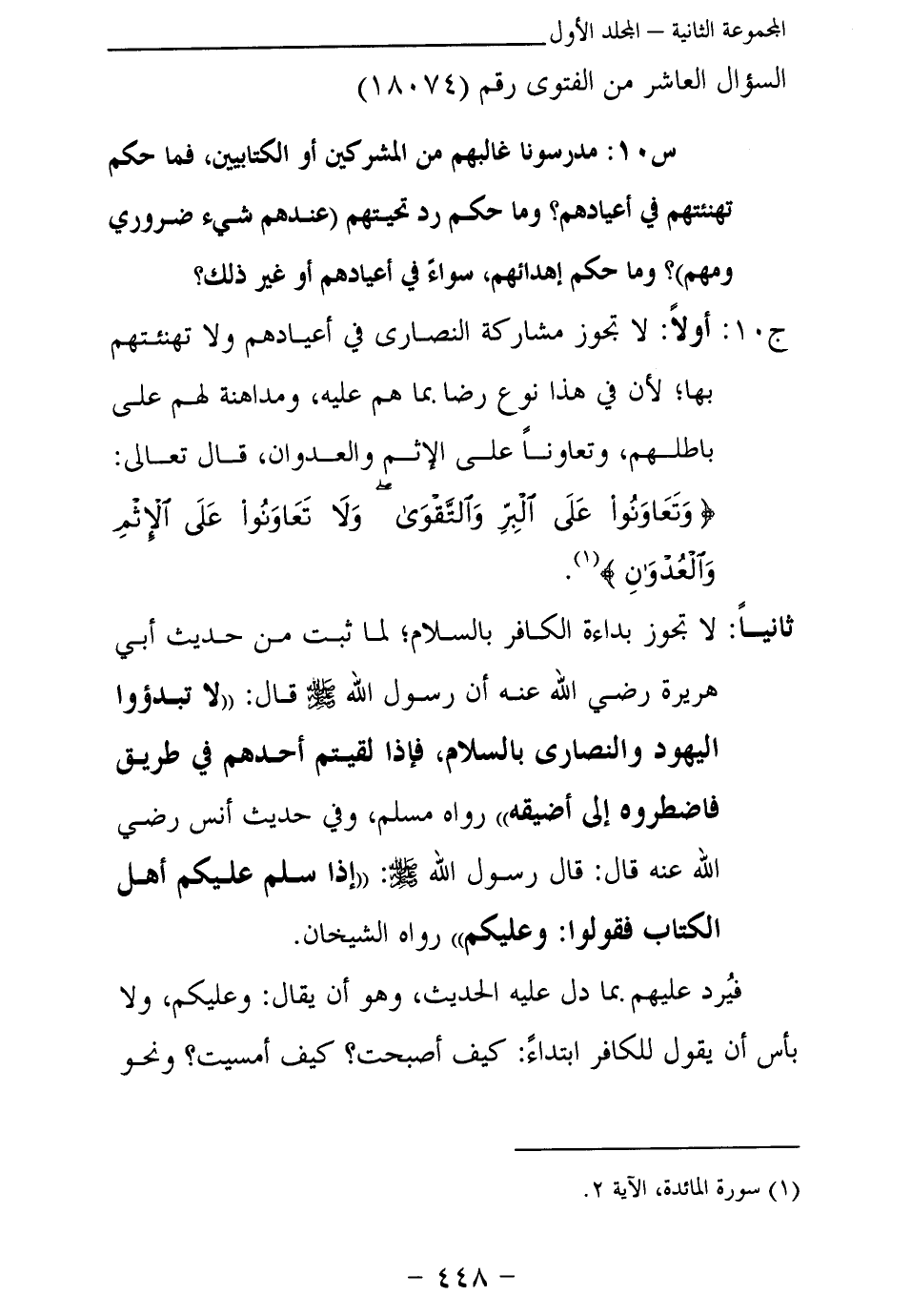 ثانيا: لا تجوز بداءة الكافر بالسلام؛ لما ثبت من حديث أبى هريرة رضي الله عنه أن رسول الله صلى الله عليه وسلم قال: «لا تبدؤوا اليهود والنصارى بالسلام، فإذا لقيتم أحدهم في طريق فاضطروه إلى أضيقه (¬2) » رواه مسلم، وفي حديث أنس رضي الله عنه قال: قال رسول الله صلى الله عليه وسلم: «إذا سلم عليكم أهل الكتاب فقولوا: وعليكم (¬3) » رواه الشيخان.