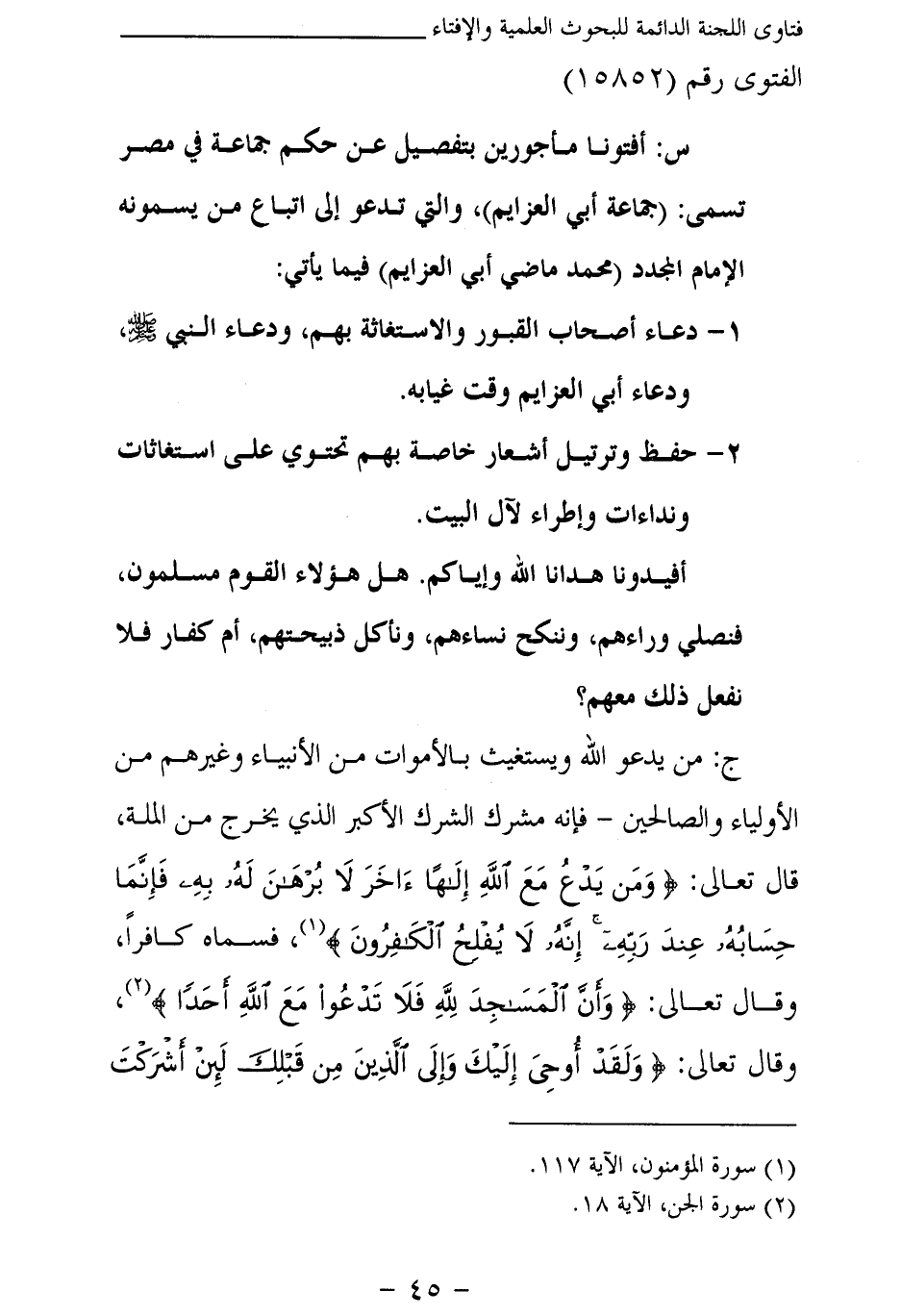 1- دعاء أصحاب القبور والاستغاثة بهم، ودعاء النبي صلى الله عليه وسلم، ودعاء أبي العزايم وقت غيابه.
