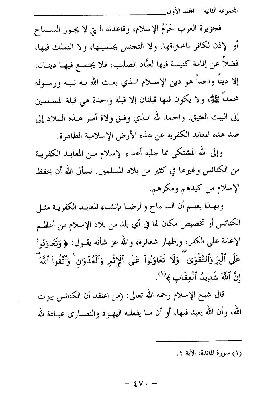 وبهذا يعلم أن السماح والرضا بإنشاء المعابد الكفرية مثل الكنائس أو تخصيص مكان لها في أي بلد من بلاد الإسلام من أعظم الإعانة على الكفر، وإظهار شعائره، والله عز شأنه يقول: {وَتَعَاوَنُوا عَلَى الْبِرِّ وَالتَّقْوَى وَلَا تَعَاوَنُوا عَلَى الْإِثْمِ وَالْعُدْوَانِ وَاتَّقُوا اللَّهَ إِنَّ اللَّهَ شَدِيدُ الْعِقَابِ} (¬1)