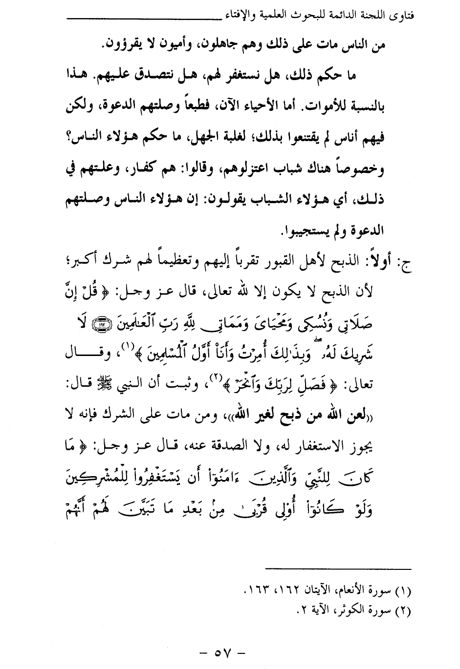 ج: أولا: الذبح لأهل القبور تقربا إليهم وتعظيما لهم شرك أكبر؛ لأن الذبح لا يكون إلا لله تعالى، قال عز وجل: {قُلْ إِنَّ صَلَاتِي وَنُسُكِي وَمَحْيَايَ وَمَمَاتِي لِلَّهِ رَبِّ الْعَالَمِينَ} (¬1) {لَا شَرِيكَ لَهُ وَبِذَلِكَ أُمِرْتُ وَأَنَا أَوَّلُ الْمُسْلِمِينَ} (¬2) وقال تعالى: {فَصَلِّ لِرَبِّكَ وَانْحَرْ} (¬3) وثبت أن النبي صلى الله عليه وسلم قال: «لعن الله من ذبح لغير الله (¬4) » ، ومن مات على الشرك فإنه لا يجوز الاستغفار له، ولا الصدقة عنه، قال عز وجل: {مَا كَانَ لِلنَّبِيِّ وَالَّذِينَ آمَنُوا أَنْ يَسْتَغْفِرُوا لِلْمُشْرِكِينَ وَلَوْ كَانُوا أُولِي قُرْبَى مِنْ بَعْدِ مَا تَبَيَّنَ لَهُمْ أَنَّهُمْ أَصْحَابُ الْجَحِيمِ} (¬5)