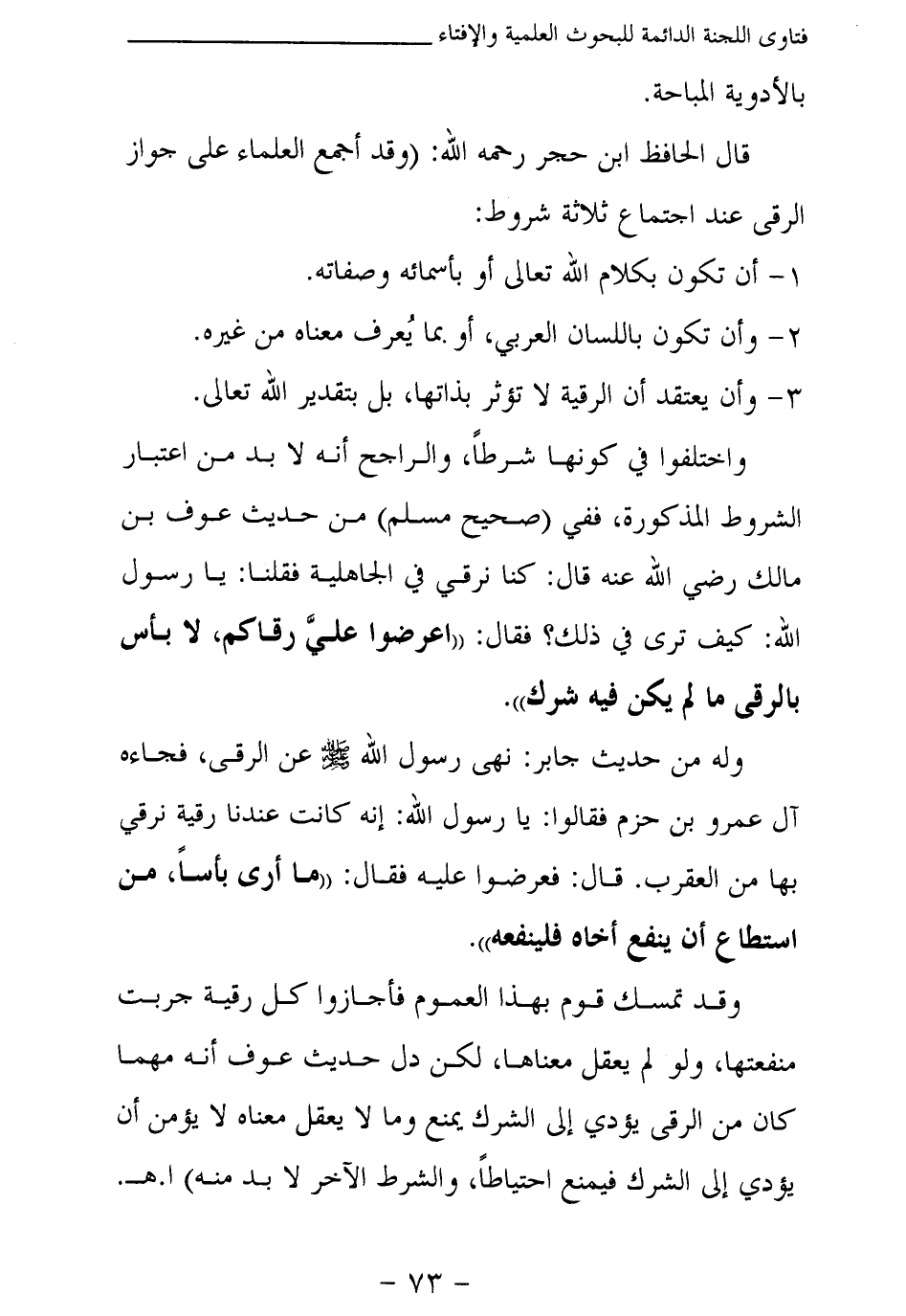 واختلفوا في كونها شرطا، والراجح أنه لا بد من اعتبار الشروط المذكورة، ففي (صحيح مسلم) من حديث عوف بن مالك رضي الله عنه قال: «كنا نرقي في الجاهلية فقلنا: يا رسول الله: كيف ترى في ذلك؟ فقال: "اعرضوا علي رقاكم، لا بأس بالرقى ما لم يكن فيه شرك (¬1) » .