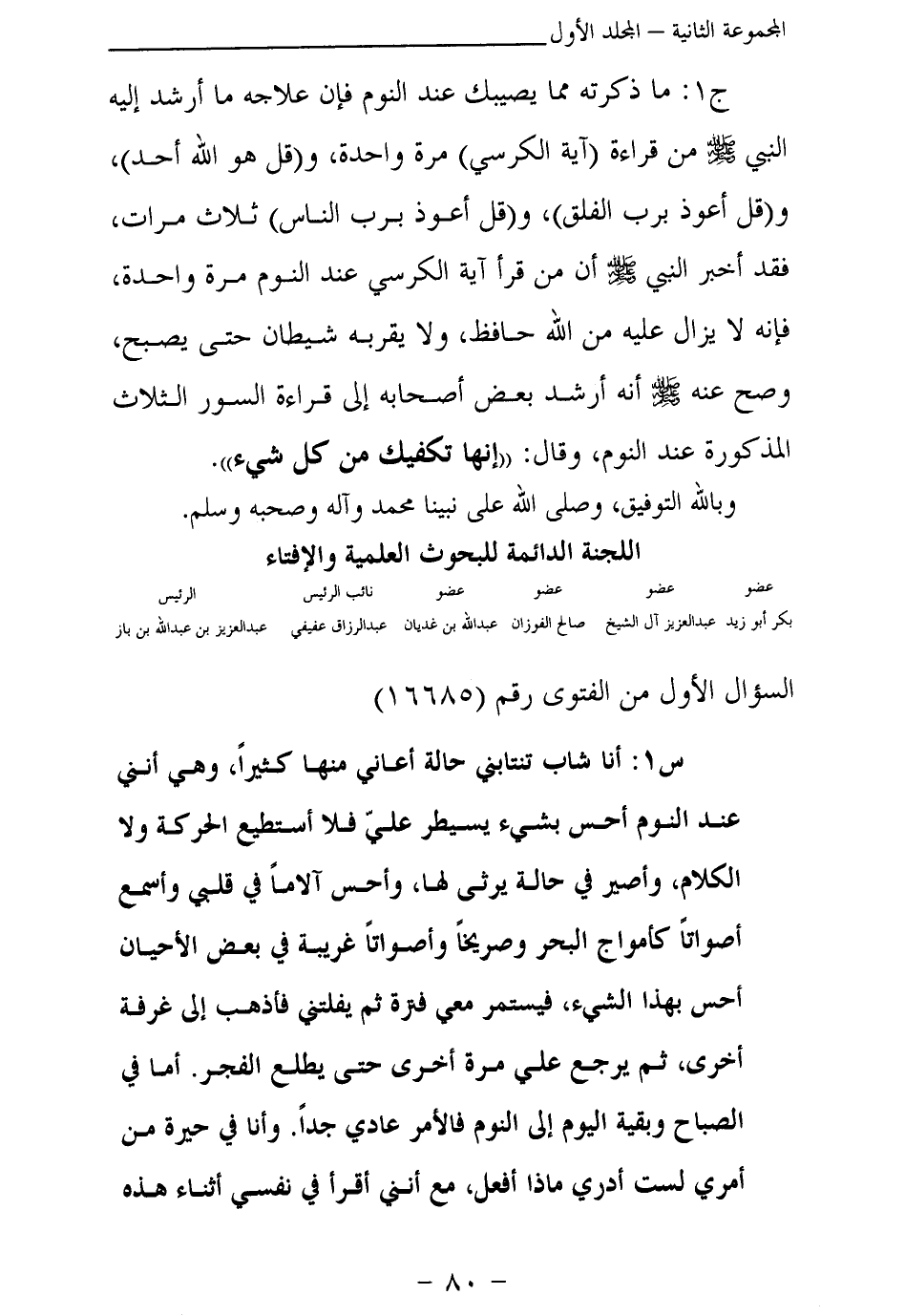 ج 1: ما ذكرته مما يصيبك عند النوم فإن علاجه ما أرشد إليه النبي صلى الله عليه وسلم من قراءة (آية الكرسي) مرة واحدة، و {قُلْ هُوَ اللَّهُ أَحَدٌ} (¬1) ، و {قُلْ أَعُوذُ بِرَبِّ الْفَلَقِ} (¬2) ، و {قُلْ أَعُوذُ بِرَبِّ النَّاسِ} (¬3) ثلاث مرات، فقد أخبر النبي صلى الله عليه وسلم أن من قرأ آية الكرسي عند النوم مرة واحدة، فإنه لا يزال عليه من الله حافظ، ولا يقربه شيطان حتى يصبح، وصح عنه صلى الله عليه وسلم أنه أرشد بعض أصحابه إلى قراءة السور الثلاث المذكورة عند النوم، وقال: «إنها تكفيك من كل شيء (¬4) » .