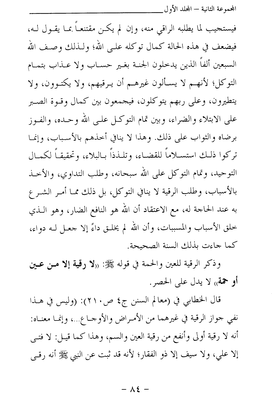 فيستجيب لما يطلبه الراقي منه، وإن لم يكن مقتنعا بما يقول له، فيضعف في هذه الحالة كمال توكله على الله؛ ولذلك وصف الله السبعين ألفا الذين يدخلون الجنة بغير حساب ولا عذاب بتمام التوكل؛ لأنهم لا يسألون غيرهم أن يرقيهم، ولا يكتوون، ولا يتطيرون، وعلى ربهم يتوكلون، فيجمعون بين كمال وقوة الصبر على الابتلاء والضراء، وبين تمام التوكل على الله وحده، والفوز برضاه والثواب على ذلك. وهذا لا ينافي أخذهم بالأسباب، وإنما تركوا ذلك استسلاما للقضاء، وتلذذا بالبلاء، وتحقيقا لكمال التوحيد، وتمام التوكل على الله سبحانه، وطلب التداوي، والأخذ بالأسباب، وطلب الرقية لا ينافي التوكل، بل ذلك مما أمر الشرع به عند الحاجة له، مع الاعتقاد أن الله هو النافع الضار، وهو الذي خلق الأسباب والمسببات، وأن الله لم يخلق داء إلا جعل له دواء، كما جاءت بذلك السنة الصحيحة.