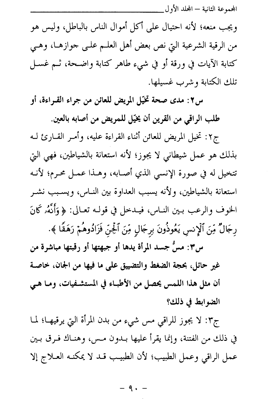 س 3: مس جسد المرأة يدها أو جبهتها أو رقبتها مباشرة من غير حائل، بحجة الضغط والتضييق على ما فيها من الجان، خاصة أن مثل هذا اللمس يحصل من الأطباء في المستشفيات، وما هي الضوابط في ذلك؟