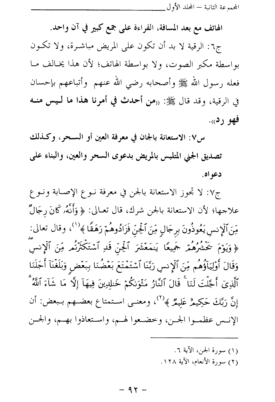 ج 7: لا تجوز الاستعانة بالجن في معرفة نوع الإصابة ونوع علاجها؛ لأن الاستعانة بالجن شرك، قال تعالى: {وَأَنَّهُ كَانَ رِجَالٌ مِنَ الْإِنْسِ يَعُوذُونَ بِرِجَالٍ مِنَ الْجِنِّ فَزَادُوهُمْ رَهَقًا} (¬1) ، وقال تعالى {وَيَوْمَ يَحْشُرُهُمْ جَمِيعًا يَامَعْشَرَ الْجِنِّ قَدِ اسْتَكْثَرْتُمْ مِنَ الْإِنْسِ وَقَالَ أَوْلِيَاؤُهُمْ مِنَ الْإِنْسِ رَبَّنَا اسْتَمْتَعَ بَعْضُنَا بِبَعْضٍ وَبَلَغْنَا أَجَلَنَا الَّذِي أَجَّلْتَ لَنَا قَالَ النَّارُ مَثْوَاكُمْ خَالِدِينَ فِيهَا إِلَّا مَا شَاءَ اللَّهُ إِنَّ رَبَّكَ حَكِيمٌ عَلِيمٌ} (¬2) ، ومعنى استمتاع بعضهم ببعض: أن الإنس عظموا الجن، وخضعوا لهم، واستعاذوا بهم، والجن