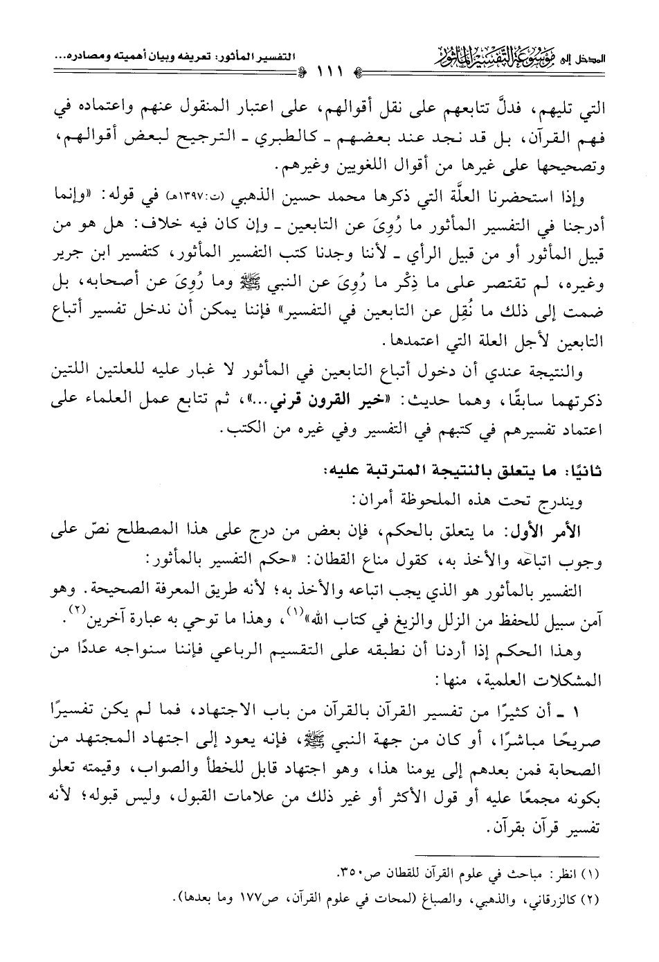الأمر الأول: ما يتعلق بالحكم، فإن بعض من درج على هذا المصطلح نصّ على وجوب اتباعه والأخذ به، كقول مناع القطان: "حكم التفسير بالمأثور: