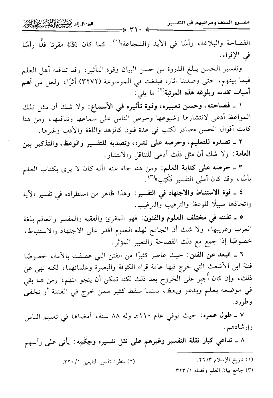 وتفسير الحسن يبلغ الذروة من حسن البيان وقوة التأثير، وقد تناقله أهل العلم فيما بينهم، حتى وصلتنا آثاره فبلغت في الموسوعة (٣٢٧٢) أثرًا، ولعل من أهم أسباب تقدمه وبلوغه هذه المرتبة (¬٢) مما يلي: