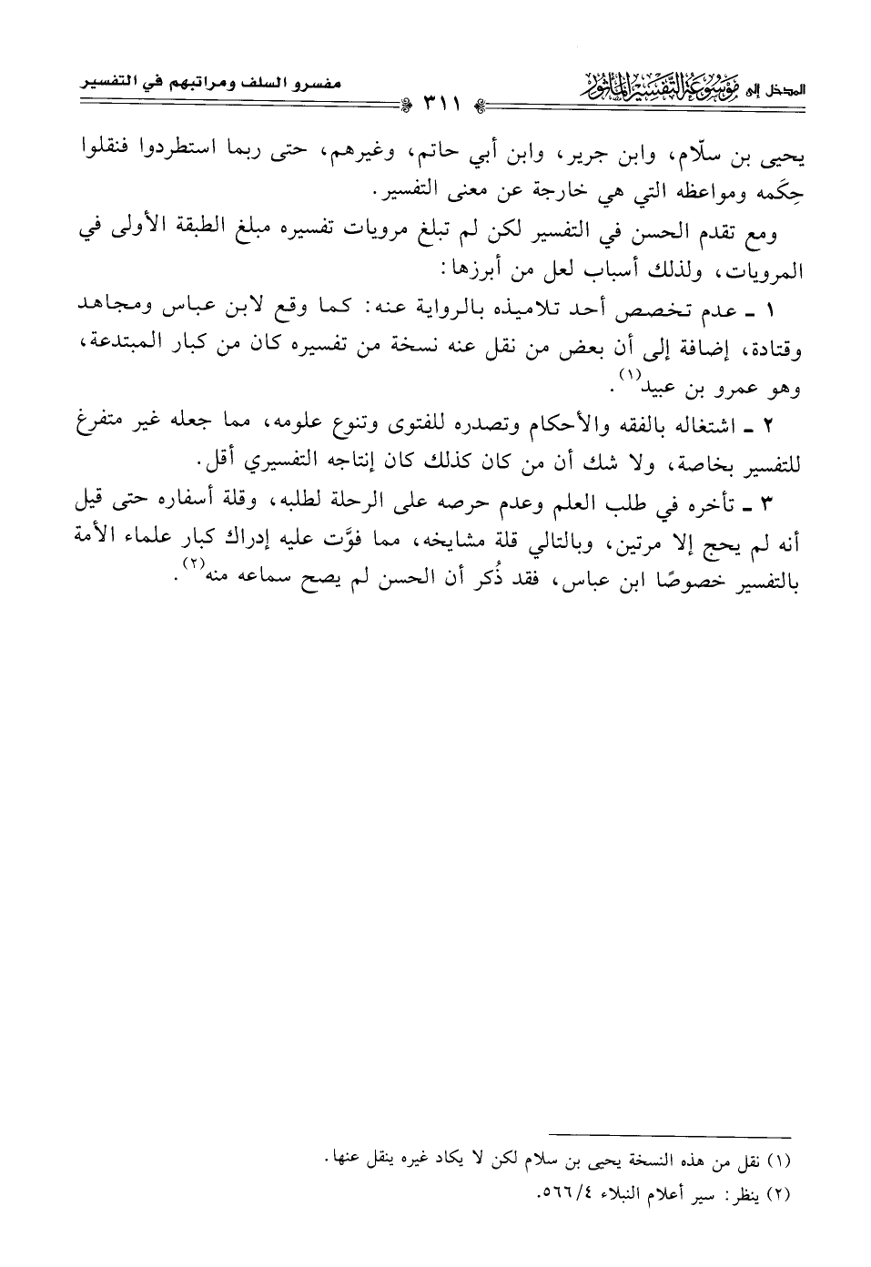 ومع تقدم الحسن في التفسير لكن لم تبلغ مرويات تفسيره مبلغ الطبقة الأولى في المرويات، ولذلك أسباب لعل من أبرزها:
