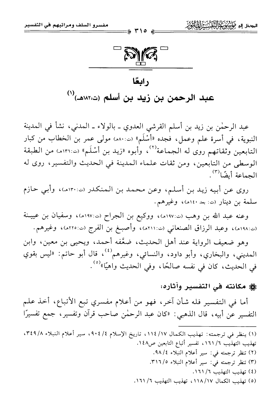 (¬١) ينظر في ترجمته: تهذيب الكمال ١٧/ ١١٤، تاريخ الإسلام ٤/ ٩٠٤، سير أعلام النبلاء ٨/ ٣٤٩، تهذيب التهذيب ٦/ ١٦١، تفسير أتباع التابعين ص ١٤٨.