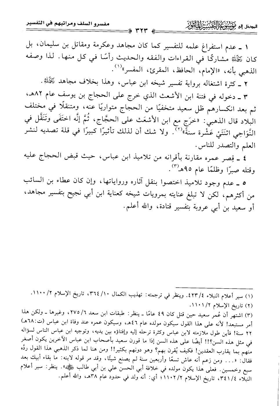 (¬٣) اشتهر أن عُمر سعيد حين قتل كان ٤٩ عامًا -ينظر: طبقات ابن سعد ٦/ ٢٧٥، وغيرها- ولكن هذا أمر مستبعد! لأنه على هذا القول سيكون مولده عام ٤٦ هـ، وسيكون عمره عند وفاة ابن عباس (ت: ٦٨ هـ) ٢٢ سنة! فأين طول ملازمته لابن عباس وكثرة ترحله إليه وإفتاؤه بين يديه، وتوجيه ابن عباس الناس لسؤاله في مثل هذه السن؟ ! ! أيضًا على هذه السن إذا ما قورن سعيد بأصحاب ابن عباس الآخرين يكون أصغر منهم بما يقارب العقدين! فكيف يُقرن بهم؛ وهو دونهم بكثير! ! ومن هنا لما ذكر الذهبي هذا القول ردَّه فقال: ". . . ومن زعم أنه عاش تسعًا وأربعين سنة لم يصنع شيئًا، وقد مر قوله لابنه: ما بقاء أبيك بعد سبع وخمسين. فعلى هذا يكون مولده في خلافة أبي الحسن علي بن أبي طالب -رضي اللَّه عنه-. ينظر: سير أعلام النبلاء ٤/ ٣٤١، تاريخ الإسلام ٢/ ١١٠٢؛ أي: أنه ولد في حدود عام ٣٨ هـ، واللَّه أعلم.