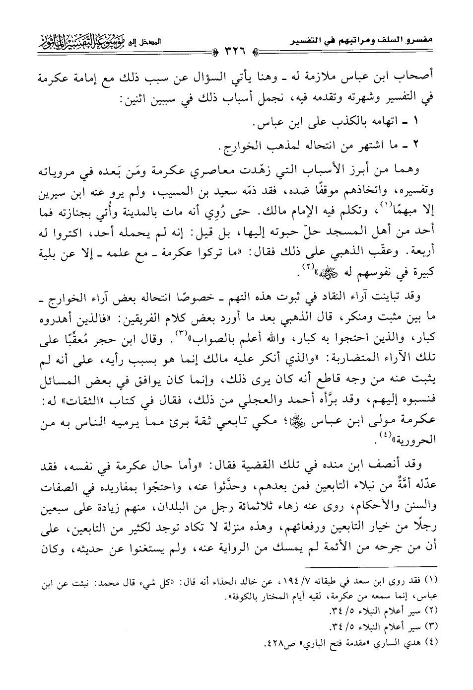 أصحاب ابن عباس ملازمة له- وهنا يأتي السؤال عن سبب ذلك مع إمامة عكرمة في التفسير وشهرته وتقدمه فيه، نجمل أسباب ذلك في سببين اثنين: