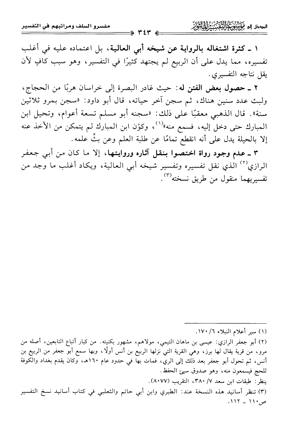 ٣ - عدم وجود رواة اختصوا بنقل آثاره وروايتها، إِلا ما كان من أبي جعفر الرازي (¬٢) الذي نقل تفسيره وتفسير شيخه أبي العالية، ويكاد أغلب ما وجد من تفسيريهما منقول من طريق نسخته (¬٣).