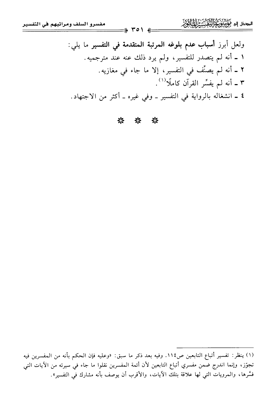 (¬١) ينظر: تفسير أتباع التابعين ص ١١٤. وفيه بعد ذكر ما سبق: "وعليه فإن الحكم بأنه من المفسرين فيه تجوّز، وإنما اندرج ضمن مفسري أتباع التابعين لأن أئمة المفسرين نقلوا ما جاء في سيرته من الآيات التي فسَّرها، والمرويات التي لها علاقة بتلك الآيات، والأقرب أن يوصف بأنه مشارك في التفسير".