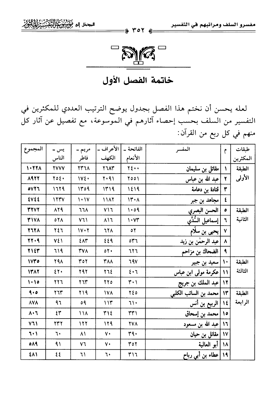 طبقات المكثرين م المفسر الفاتحة - الأنعام الأعراف - الكهف مريم - فاطر يس - الناس المجموعالطبقة الأولى ١ مقاتل بن سليمان ٢٤٠٠ ٢٦٨٣ ٢٣٦٨ ٢٧٧٧ ١٠٢٢٨ ٢ عبد اللَّه بن عباس ٢٥٥١ ٢٠٩١ ١٧٤٠ ٢٥٤٠ ٨٩٢٢ ٣ قتادة بن دعامة ١٤١٩ ١٣١٩ ١٣٥٩ ١٦٢٩ ٥٧٢٦ ٤ مجاهد بن جبر ١٣٠٨ ١١٨٢ ١٠١٧ ١٢٣٧ ٤٧٤٤الطبقة الثانية ٥ الحسن البصرى ١٠٥٩ ٧١٦ ٦٦٨ ٨٢٩ ٣٢٧٢ ٦ إسماعيل السُّدِّي ١٠٧٣ ٨١٦ ٧٦١ ٥٢٨ ٣١٧٨ ٧ يحيى بن سلَّام ٥٢ ٦٢٨ ١٧٠٢ ٢٤٦ ٢٦٢٨ ٨ عبد الرحمن بن زيد ٥٣٦ ٤٤٩ ٤٨٣ ٧٤١ ٢٢٠٩ ٩ الضحاك بن مزاحم ٦٢٦ ٥٢٠ ٣٧٨ ٦١٩ ٢١٤٣الطبقة الثالثة ١٠ سعيد بن جبير ٦٩٧ ٣٨٨ ٣٥٢ ٢٩٨ ١٧٣٥ ١١ عكرمة مولى ابن عباس ٤٠٦ ٢٦٤ ٢٩٢ ٤٢٠ ١٣٨٢ ١٢ عبد الملك بن جريج ٣٠١ ٢٢٥ ٢٦٣ ٢٢٦ ١٠١٥الطبقة الرابعة ١٣ محمد بن السائب الكلبي ٢٤٥ ١٧٨ ٢١٩ ٢٦٣ ٩٠٥ ١٤ الربيع بن أنس ٦١٠ ١١٣ ٥٩ ٩٦ ٨٧٨ ١٥ محمد بن إسحاق ٣٣١ ٣١٤ ١١٨ ٤٣ ٨٠٦ ١٦ عبد اللَّه بن مسعود ٢٧٨ ١٢٩ ١٢٢ ٢٣٢ ٧٦١ ١٧ مقاتل بن حيان ٣٩٠ ٧٠ ٨١ ٦٠ ٦٠١ ١٨ أبو العالية ٣٥٢ ٧٠ ٧٦ ٩١ ٥٨٩ ١٩ عطاء بن أبي رباح ٣١٦ ٦٠ ٦١ ٤٤ ٤٨١