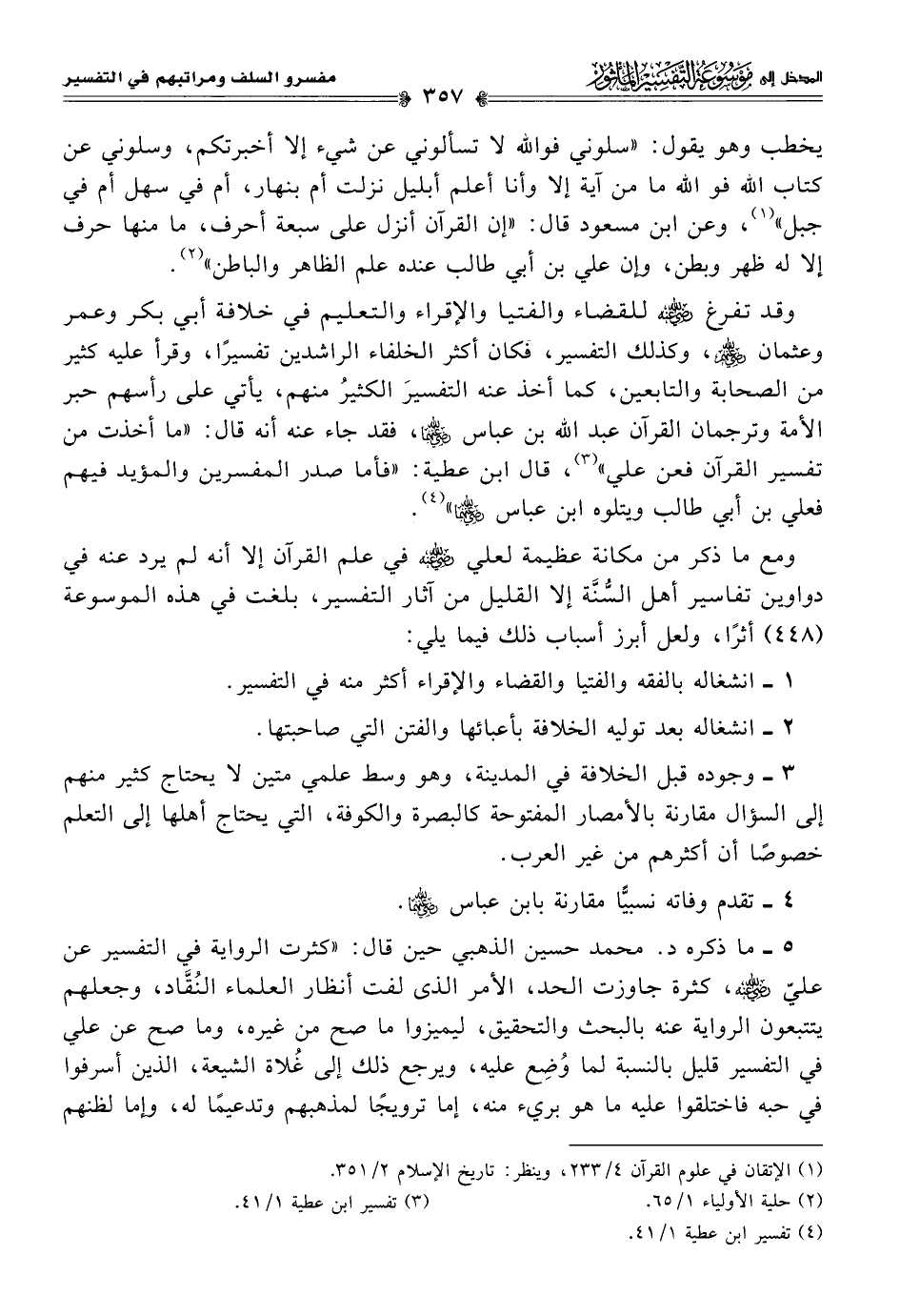 وقد تفرغ -رضي اللَّه عنه- للقضاء والفتيا والإقراء والتعليم في خلافة أبي بكر وعمر وعثمان -رضي اللَّه عنهم-، وكذلك التفسير، فكان أكثر الخلفاء الراشدين تفسيرًا، وقرأ عليه كثير من الصحابة والتابعين، كما أخذ عنه التفسيرَ الكثيرُ منهم، يأتي على رأسهم حبر الأمة وترجمان القرآن عبد اللَّه بن عباس -رضي اللَّه عنهما-، فقد جاء عنه أنه قال: "ما أخذت من تفسير القرآن فعن علي" (¬٣)، قال ابن عطية: "فأما صدر المفسرين والمؤيد فيهم فعلي بن أبي طالب ويتلوه ابن عباس -رضي اللَّه عنهما-" (¬٤).
