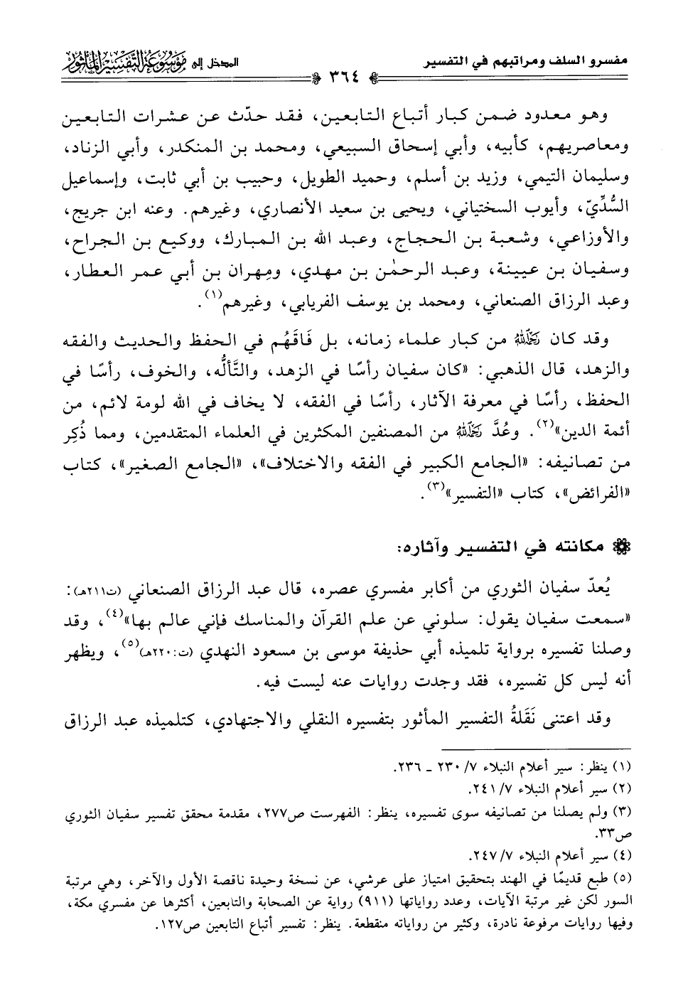 (¬٥) طبع قديمًا في الهند بتحقيق امتياز على عرشي، عن نسخة وحيدة ناقصة الأول والآخر، وهي مرتبة السور لكن غير مرتبة الآيات، وعدد رواياتها (٩١١) رواية عن الصحابة والتابعين، أكثرها عن مفسري مكة، وفيها روايات مرفوعة نادرة، وكثير من رواياته منقطعة. ينظر: تفسير أتباع التابعين ص ١٢٧.
