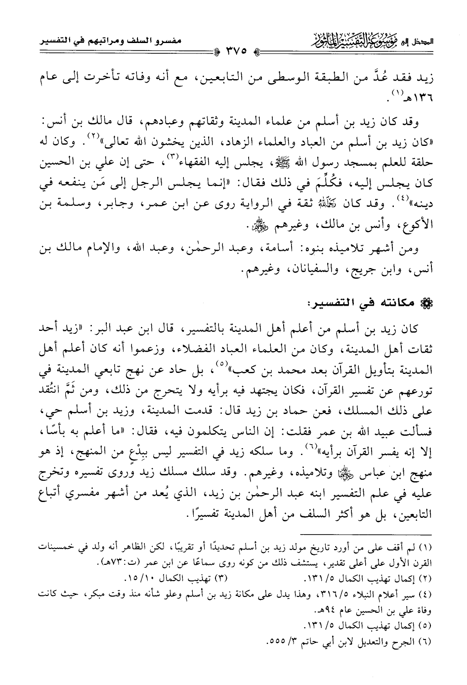 (¬٤) سير أعلام النبلاء ٥/ ٣١٦، وهذا يدل على مكانة زيد بن أسلم وعلو شأنه منذ وقت مبكر، حيث كانت وفاة علي بن الحسين عام ٩٤ هـ.
