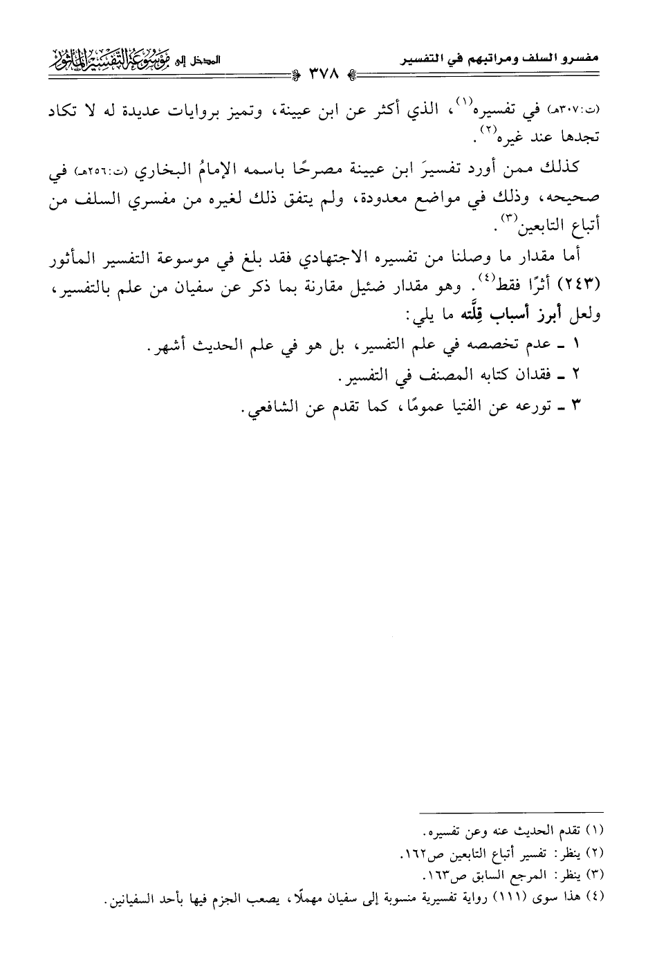 أما مقدار ما وصلنا من تفسيره الاجتهادي فقد بلغ في موسوعة التفسير المأثور (٢٤٣) أثرًا فقط (¬٤). وهو مقدار ضئيل مقارنة بما ذكر عن سفيان من علم بالتفسير، ولعل أبرز أسباب قِلَّته ما يلي: