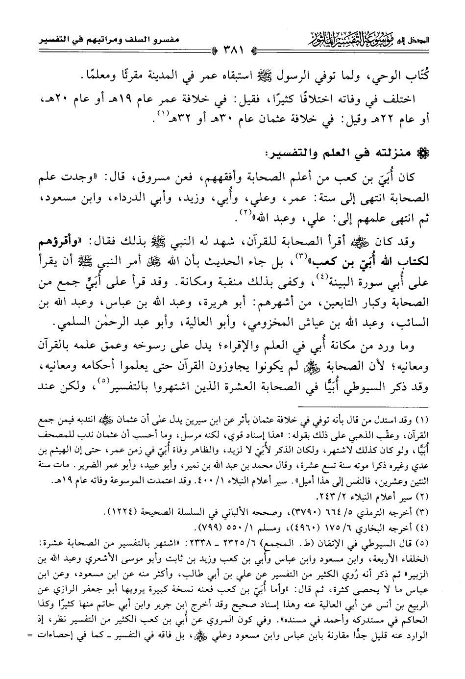 (¬٥) قال السيوطي في الإتقان (ط. المجمع) ٦/ ٢٣٢٥ - ٢٣٣٨: "اشتهر بالتفسير من الصحابة عشرة: الخلفاء الأربعة، وابن مسعود وابن عباس وأبي بن كعب وزيد بن ثابت وأبو موسى الأشعري وعبد اللَّه بن الزبير" ثم ذكر أنه رُوي الكئير من التفسير عن علي بن أبي طالب، وأكثر منه عن ابن مسعود، وعن ابن عباس ما لا يحصى كثرة، ثم قال: "وأما أُبَيّ بن كعب فعنه نسخة كبيرة يرويها أبو جعفر الرازي عن الربيع بن أنس عن أبي العالية عنه وهذا إسناد صحيح وقد أخرج ابن جرير وابن أبي حاتم منها كثيرًا وكذا الحاكم في مستدركه وأحمد في مسنده". وفي كون المروي عن أُبي بن كعب الكثير من التفسير نظر، إذ الوارد عنه قليل جدًّا مقارنة بابن عباس وابن مسعود وعلي -رضي اللَّه عنهم-، بل فاقه في التفسير -كما في إحصاءات =