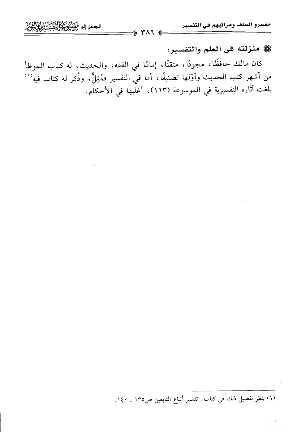 كان مالك حافظًا، مجودًا، متقنًا، إمامًا في الفقه، والحديث، له كتاب الموطأ من أشهر كتب الحديث وأوّلها تصنيفًا، أما في التفسير فمُقِلٌّ، وذُكر له كتاب فيه (¬١) بلغت آثاره التفسيرية في الموسوعة (١١٣)، أغلبها في الأحكام.