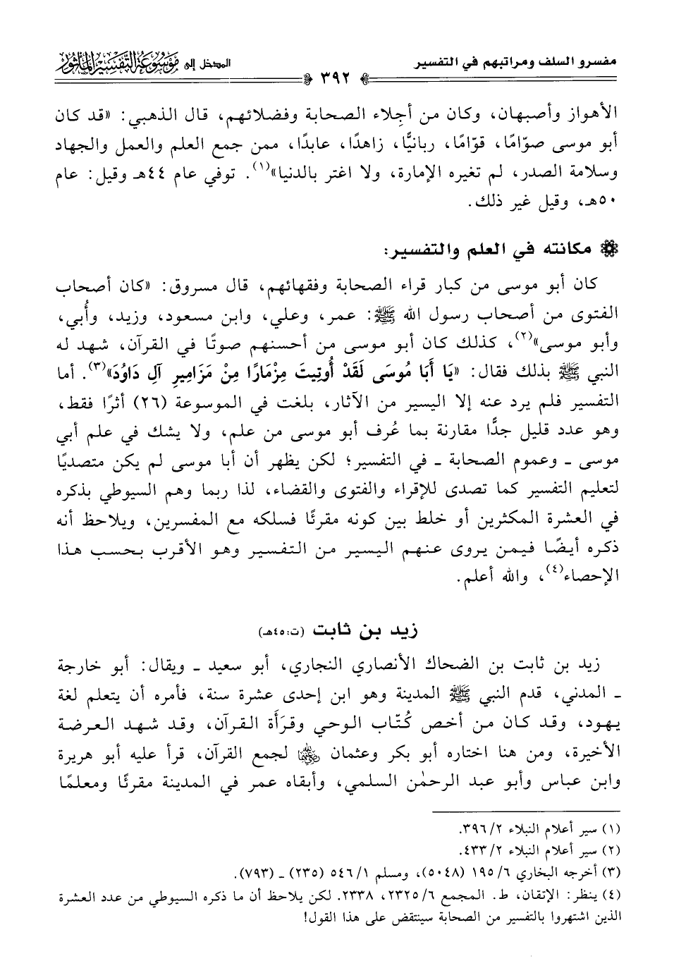كان أبو موسى من كبار قراء الصحابة وفقهائهم، قال مسروق: "كان أصحاب الفتوى من أصحاب رسول اللَّه -صلى اللَّه عليه وسلم-: عمر، وعلي، وابن مسعود، وزيد، وأُبي، وأبو موسى" (¬٢)، كذلك كان أبو موسى من أحسنهم صوتًا في القرآن، شهد له النبي -صلى اللَّه عليه وسلم- بذلك فقال: "يَا أَبَا مُوسَى لَقَدْ أُوتِيتَ مِزْمَارًا مِنْ مَزَامِيرِ آلِ دَاوُدَ" (¬٣). أما التفسير فلم يرد عنه إلا اليسير من الآثار، بلغت في الموسوعة (٢٦) أثرًا فقط، وهو عدد قليل جدًّا مقارنة بما عُرف أبو موسى من علم، ولا يشك في علم أبي موسى -وعموم الصحابة- في التفسير؛ لكن يظهر أن أبا موسى لم يكن متصديًا لتعليم التفسير كما تصدى للإقراء والفتوى والقضاء، لذا ربما وهم السيوطي بذكره في العشرة المكثرين أو خلط بين كونه مقرئًا فسلكه مع المفسرين، ويلاحظ أنه ذكره أيضًا فيمن يروى عنهم اليسير من التفسير وهو الأقرب بحسب هذا الإحصاء (¬٤)، واللَّه أعلم.